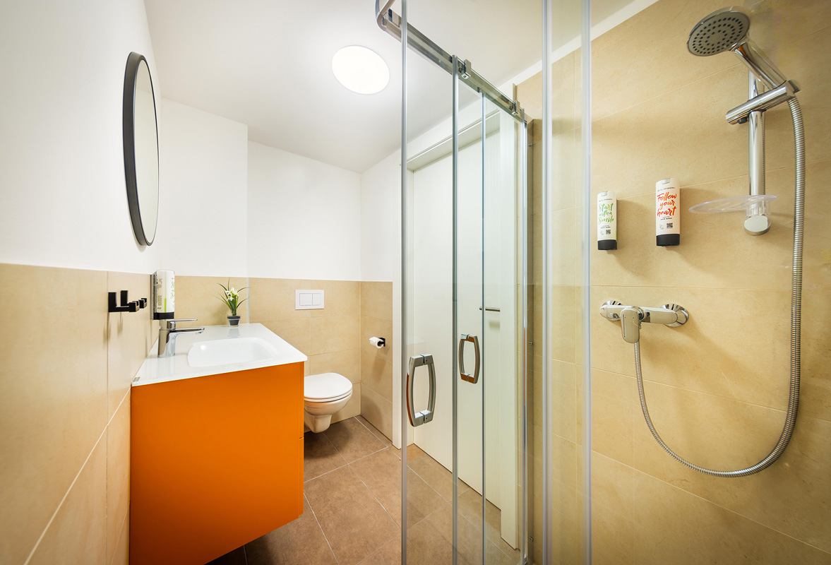 22 m² - ložnice s manželskou postelí, obývací pokoj s posezením a kuchyňským koutem, sociální zařízení se sprchou; zpravidla dvoupatrový pokoj s ložnicí v horní části přístupné po schodech
