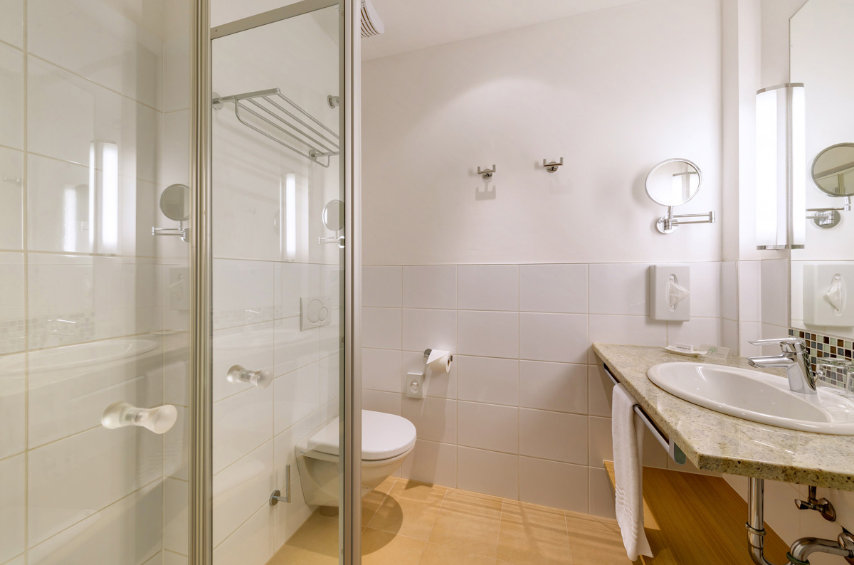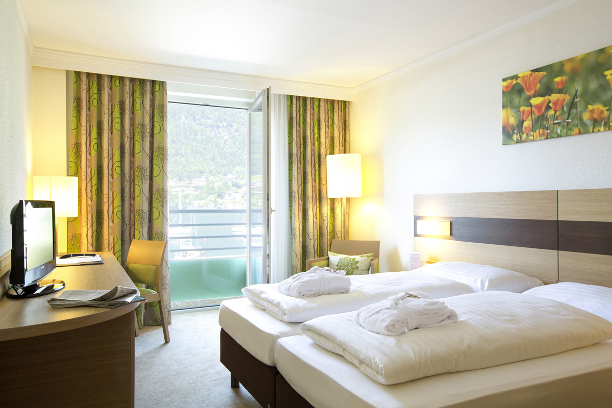 24 m² - pokoj s manželskou postelí či 2 samostanými lůžky, sociální zařízení, balkon s výhledem na jezero; nelze ubytovat infant