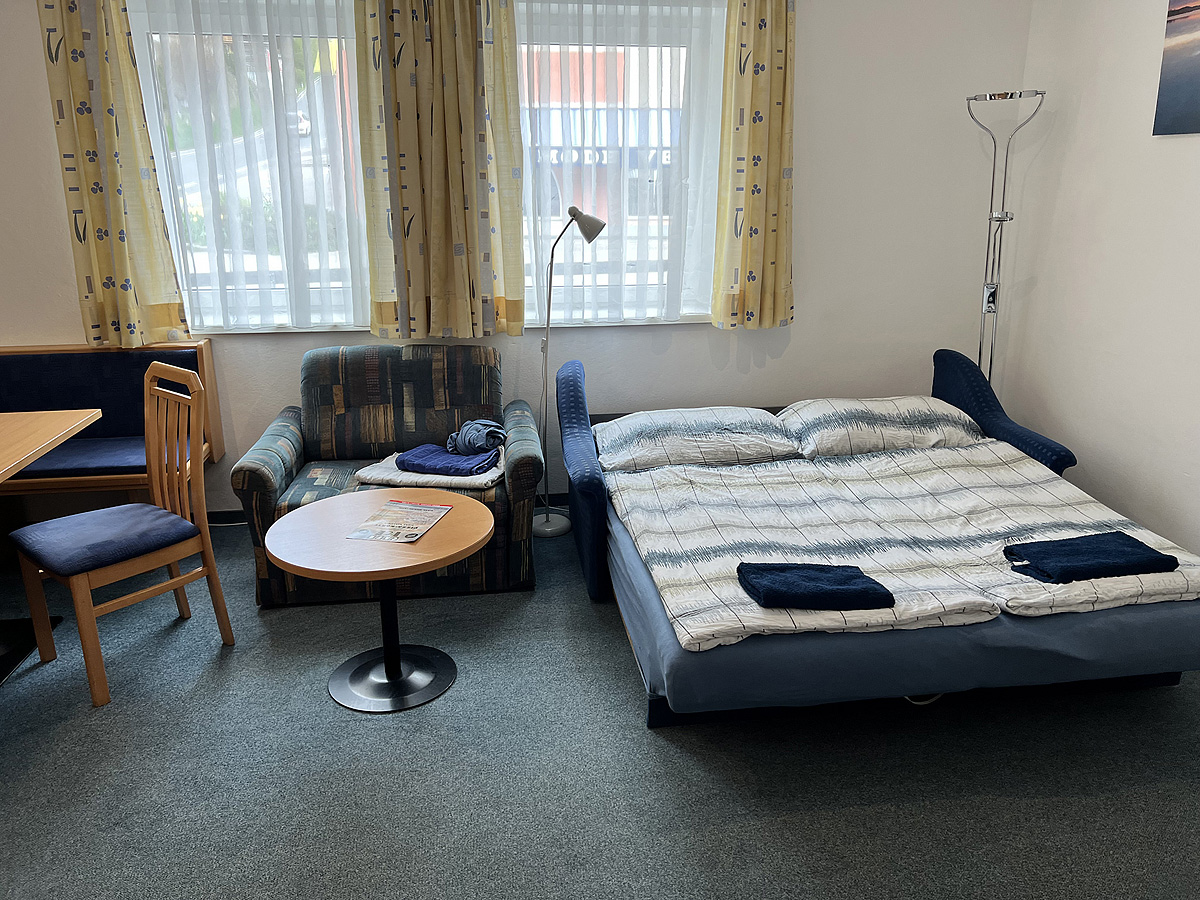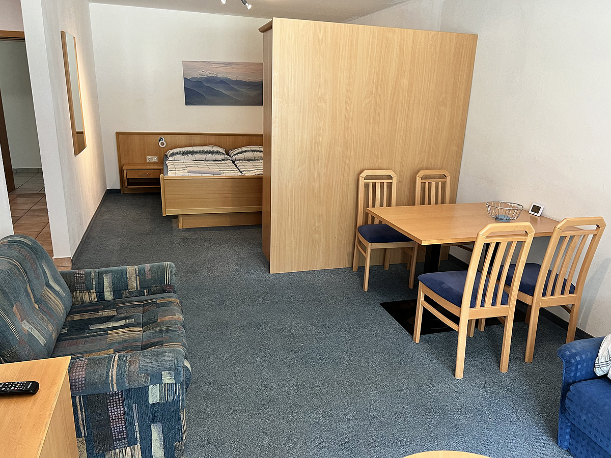40 až 49 m² - 1 ložnice s manželskou postelí, obývací pokoj s rozkládacím gaučem pro 2 osoby a rozkládacím křeslem pro 1 osobu, kuchyňský kout, sociální zařízení, oddělené WC