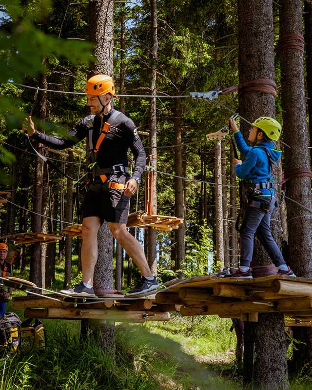 adrenalinový lanový park: různé úrovně obtížnosti s více než 60 překážkami, ziplinou a 500 m dlouhá stezka korunami stromů
