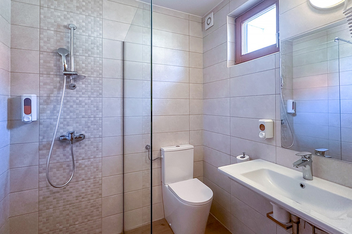 pokoj s manželskou postelí a rozkládací pohovkou pro 1 dítě do 15 let v přízemí, sociální zařízení se sprchou / WC, terasa