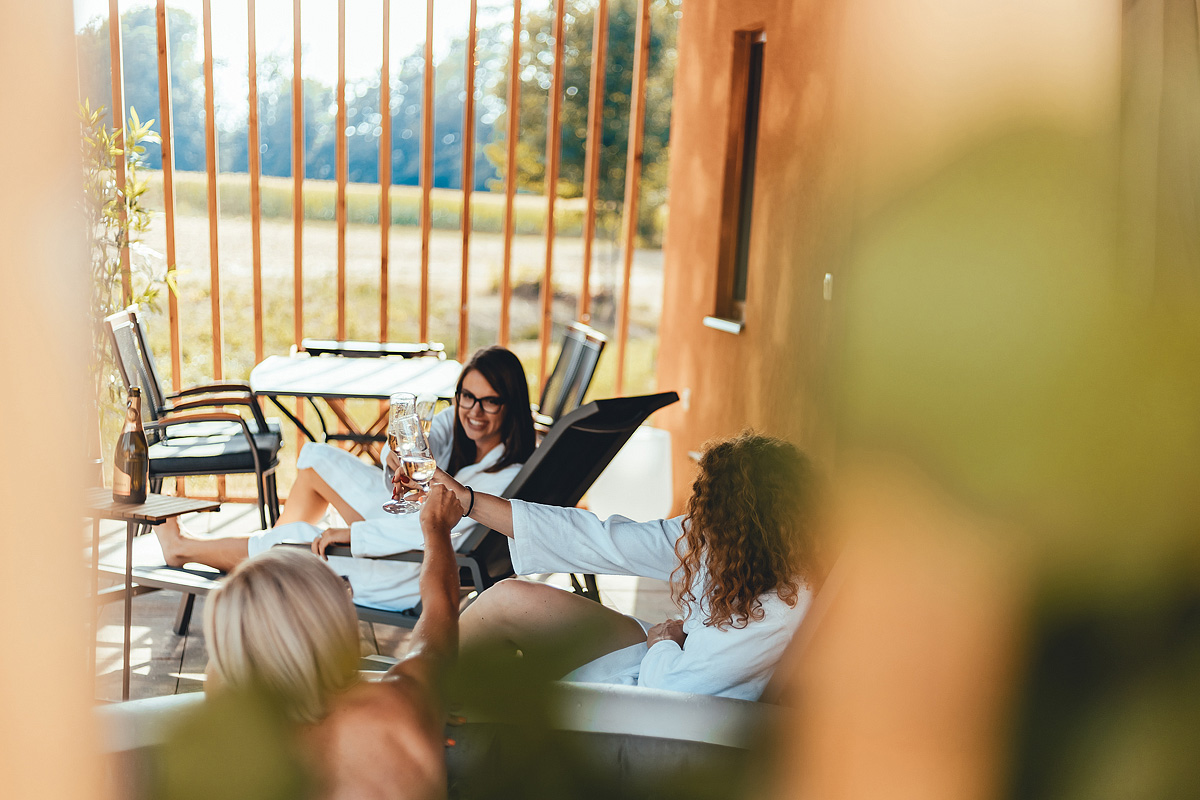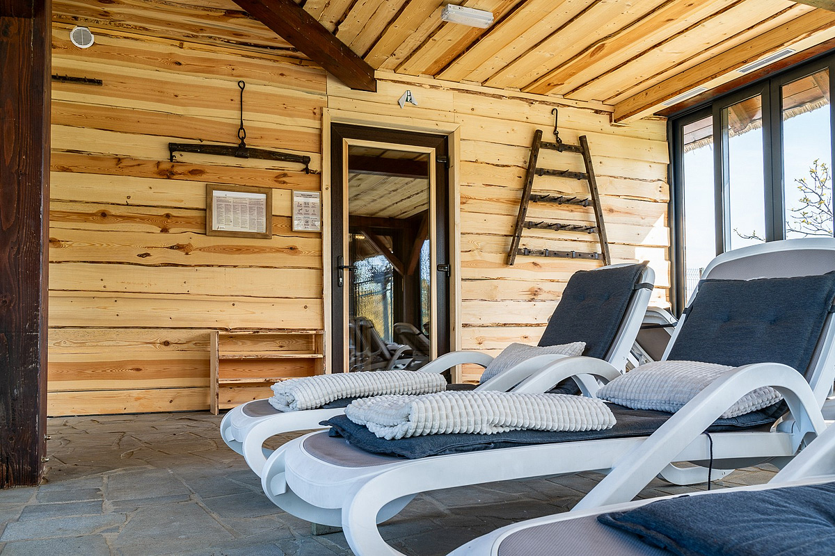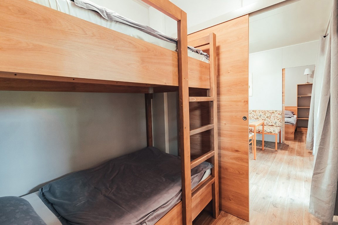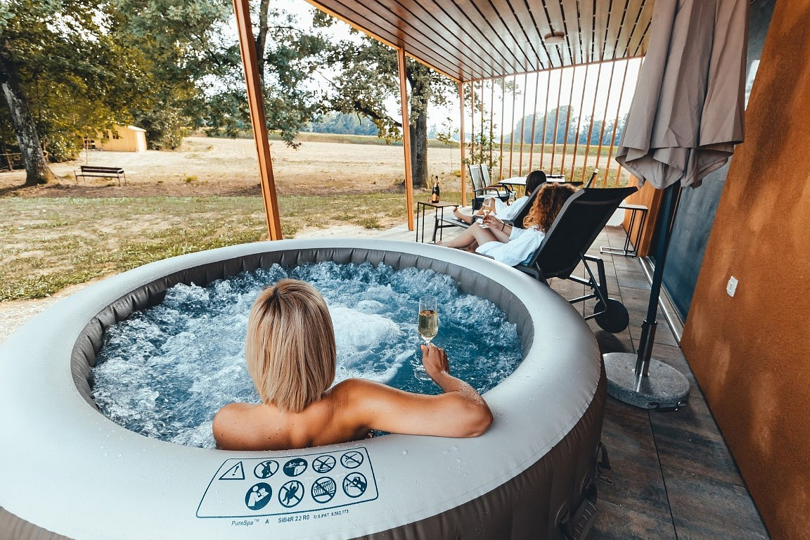 ložnice s manželskou postelí, ložnice s 1 lůžkem, ložnice s patrovou postelí, kuchyňský kout s obývacím prostorem, zastřešená terasa s posezením, soukromá vířivka s termální vodou, sociální zařízení se sprchou / WC, klimatizace