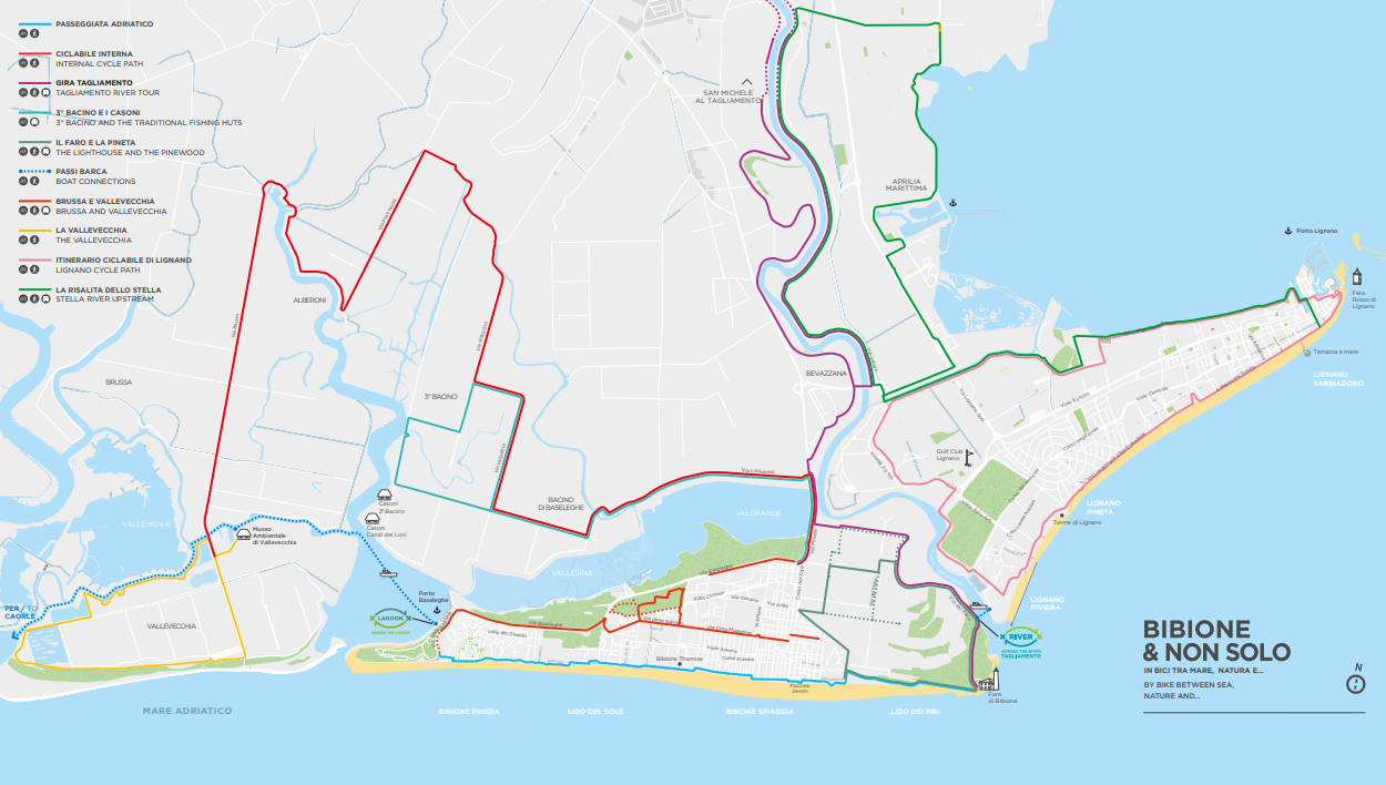 Těm, kteří chtějí vyrazit na kole pryč z města, se budou líbit trasy vedoucí na venkov k různým blízkým vesničkám nebo místním farmám s možností ochutnávky tradičních produktů. Zdatným cyklistům doporučujeme cyklistickou stezku z Bibione podél řeky Tagliamento.