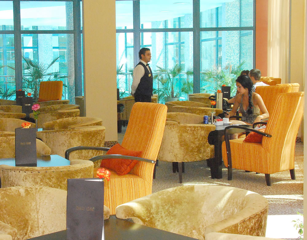 Recepce, trezor za poplatek, směnárna, výtahy, lobby bar, restaurace, restaurace a la carte, nákupní arkáda, konferenční sál. Venku 2 bazény (jeden menší, zpola krytý), bar u bazénu a terasa s lehátky a slunečníky zdarma, osušky oproti kauci.