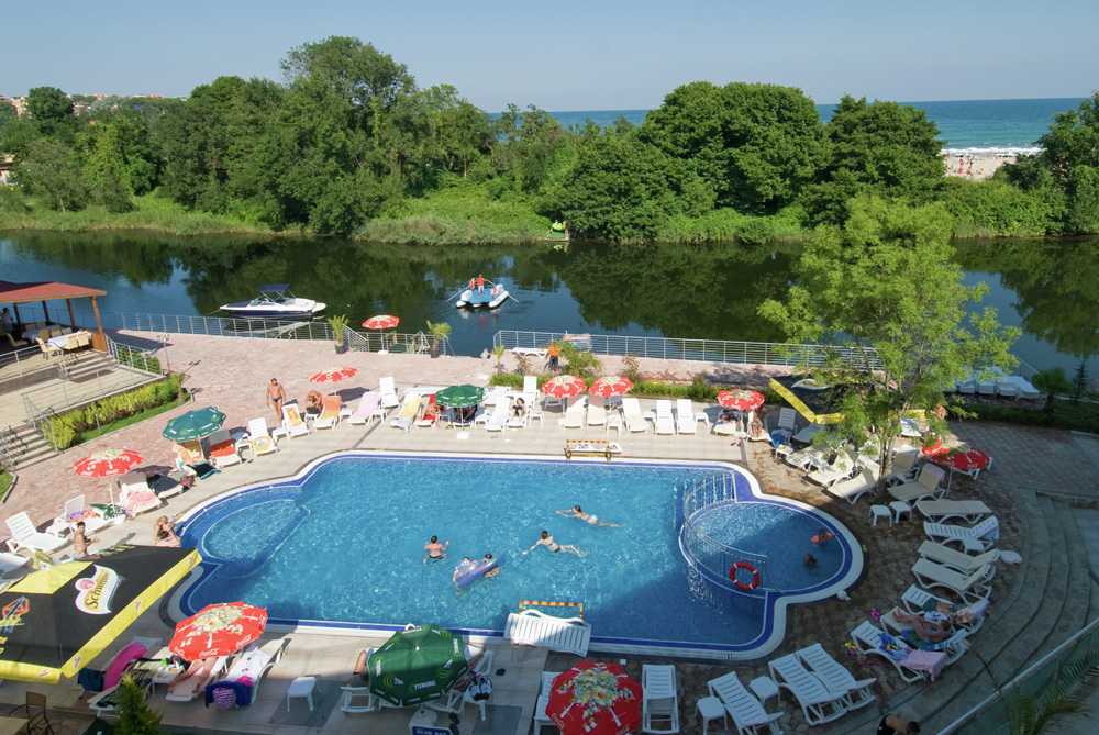 Písečná pláž jen cca 50 m přes řeku (přeprava loďkou každých cca 5 minut), lehátka a slunečníky za poplatek.