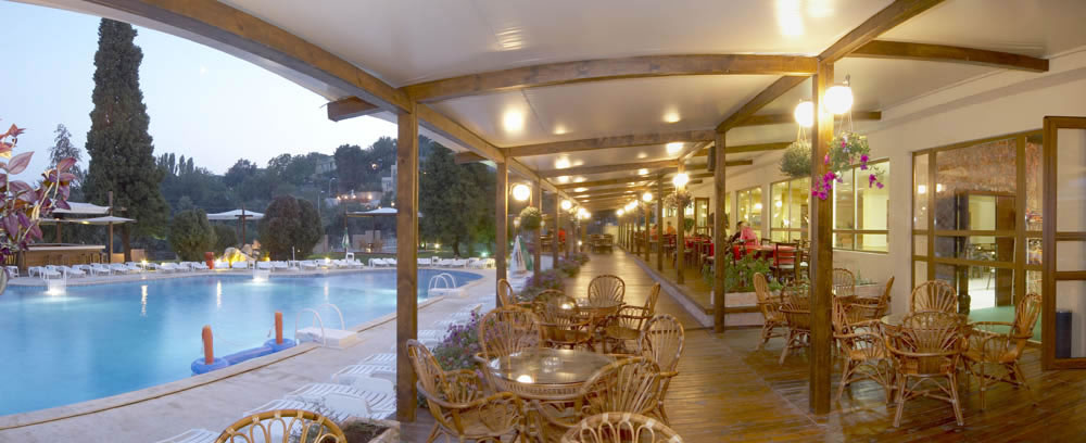Vstupní hala s recepcí, výtah, restaurace, barbecue restaurace, bazén, bar u bazénu, směnárna, venkovní terasa.