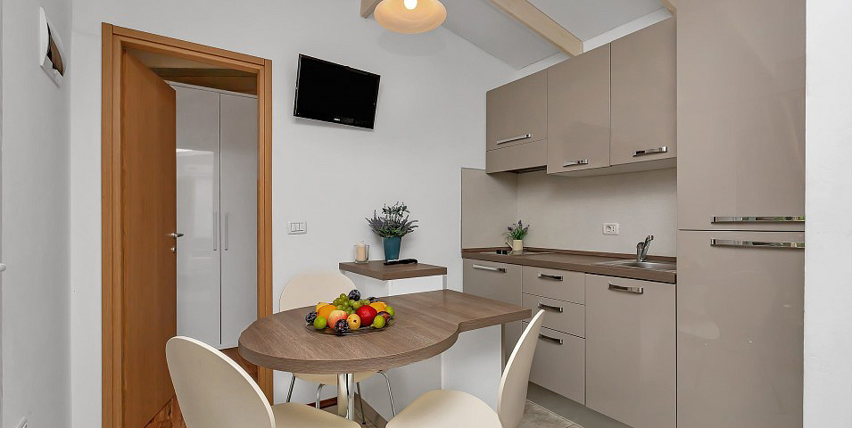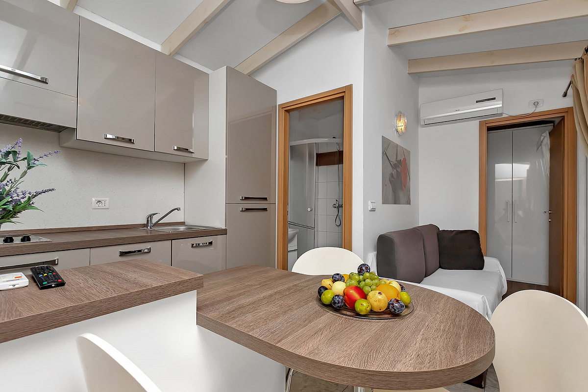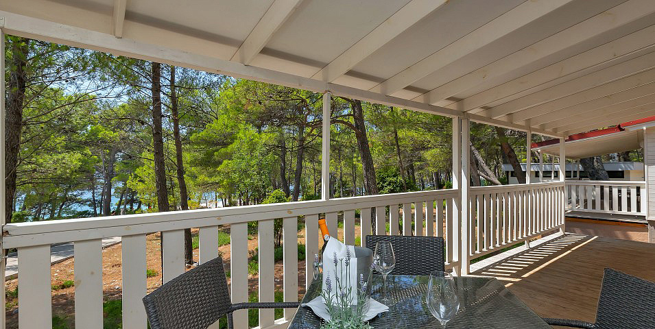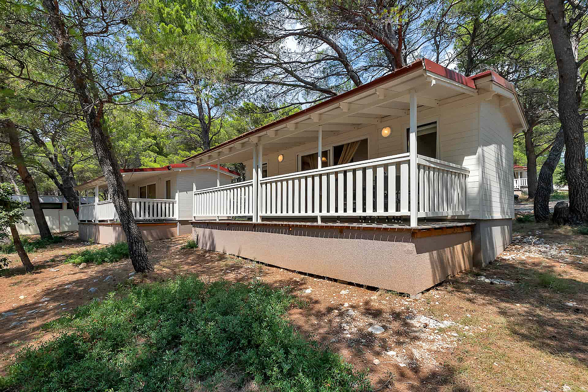 24 m² -1 ložnice s manželskou postelí, 1 ložnice se 2 samostatnými lůžky, obývací pokoj s plně vybaveným kuchyňským koutem, sociální zařízení se sprchou, zastřešená terasa se zahradním nábytkem
