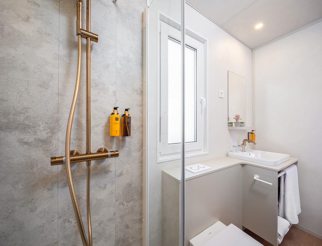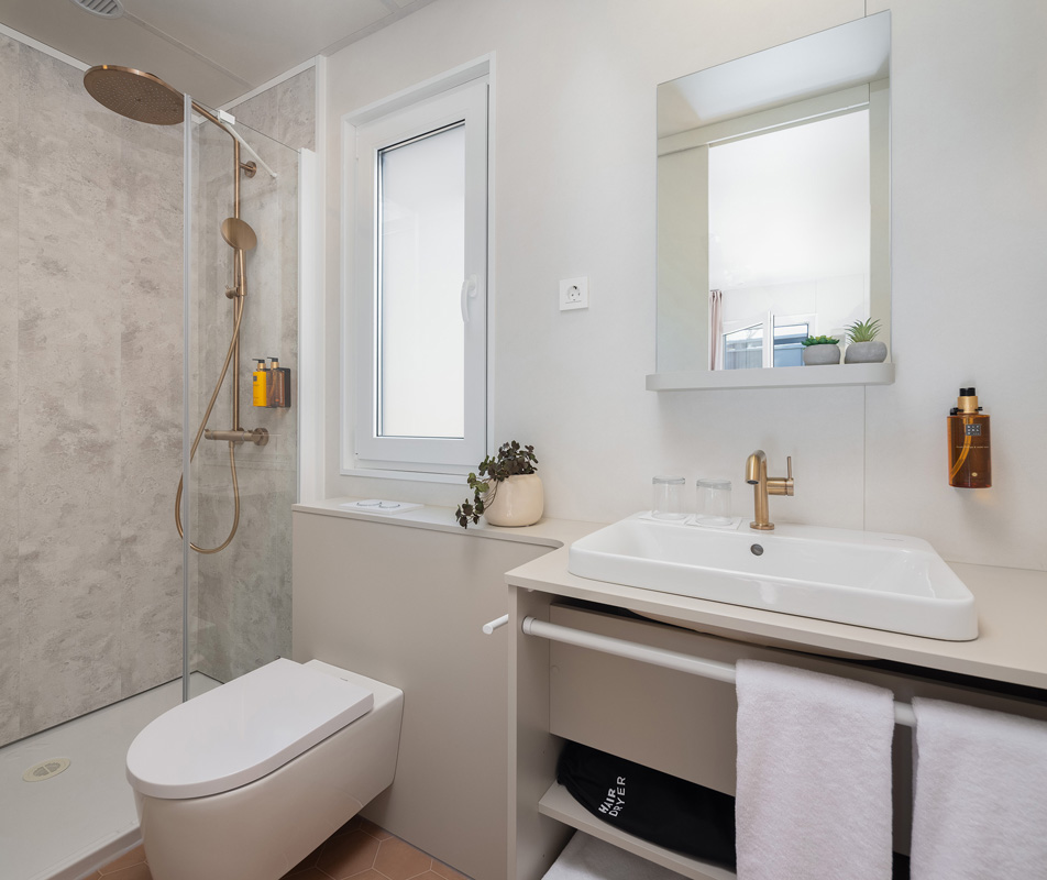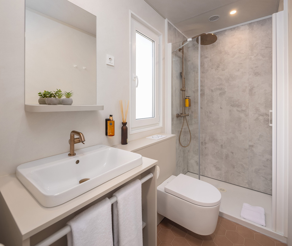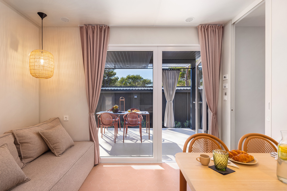 Mobile home typu premium se nachází v centrální části kempu v blízkosti bazénového komplexu a dětského hřiště.