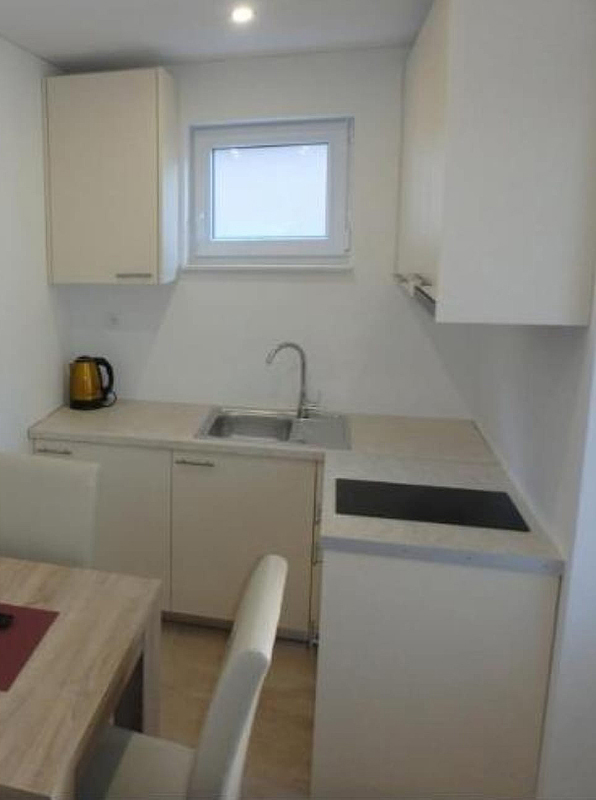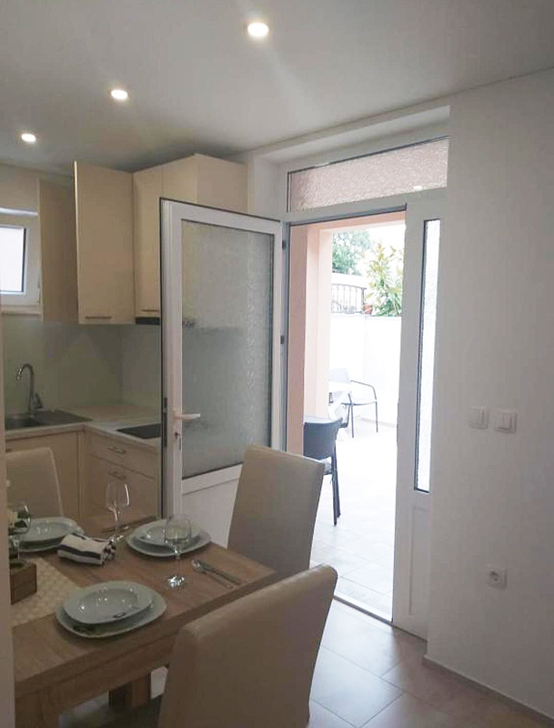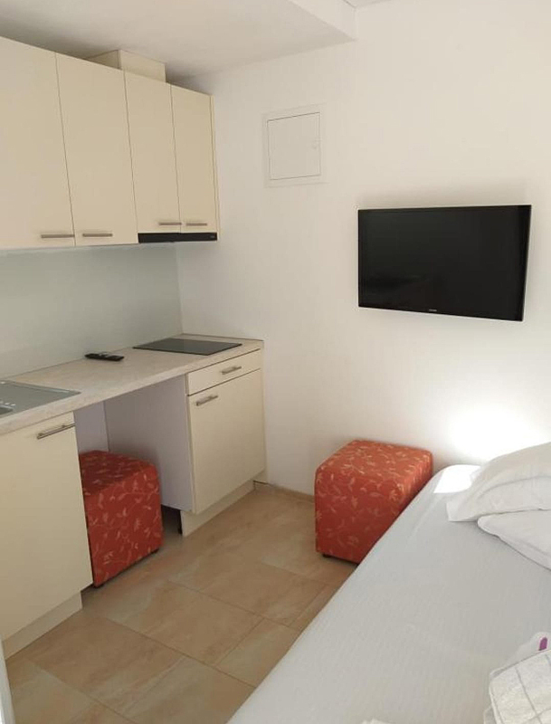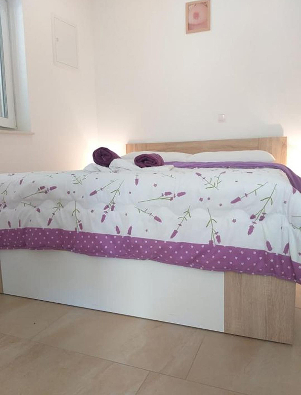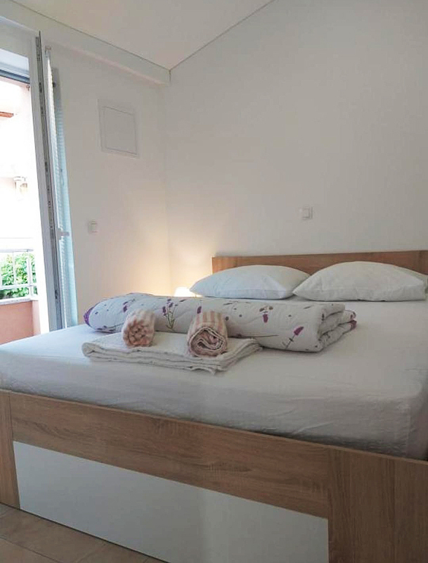 ložnice s manželskou postelí, obývací pokoj s vybaveným kuchyňským koutem a přistýlkou formou rozkládacího gauče pro jednu dospělou osobu nebo dvě děti do nedovršených 12 let, sociální zařízení se sprchou, sociální zařízení se sprchou, dva balkony - jeden orientovaný do ulice, druhý balkon s výhledem na moře