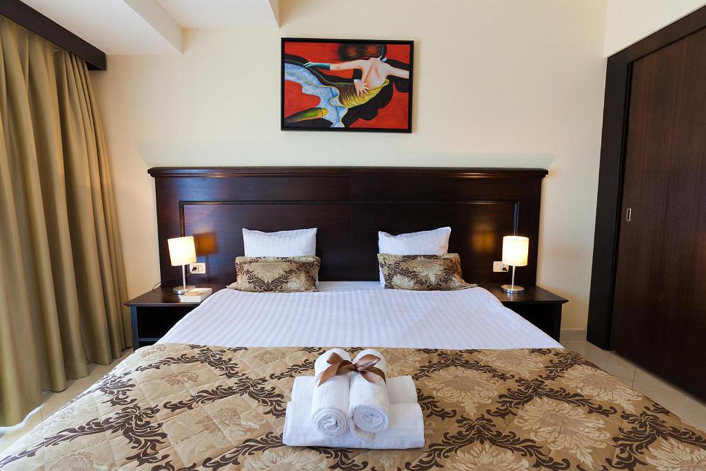Family Superior 4+2 balkon M - pokoj s manželskou postelí a pokoj se 2 samostatnými lůžky, rozkládací pohovka pro 2 děti do nedovršených 12 let, sociální zařízení s vanou, balkon orientovaný k moři