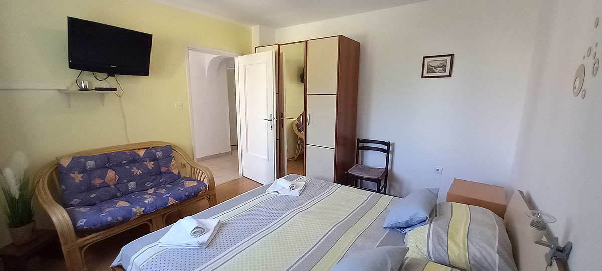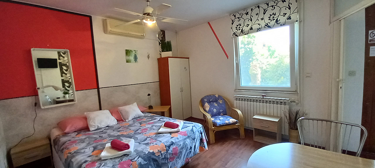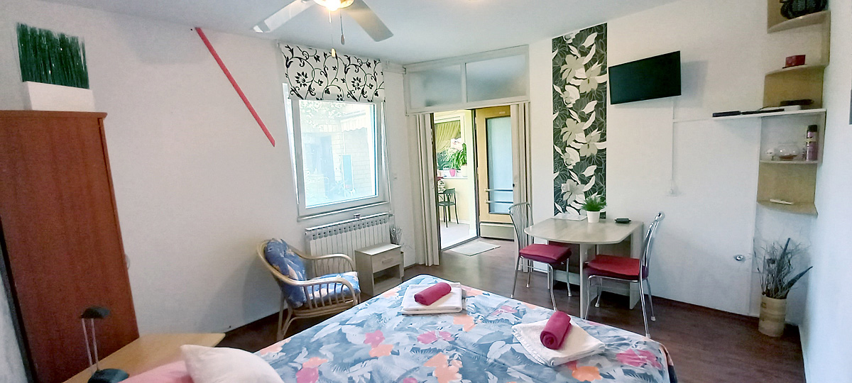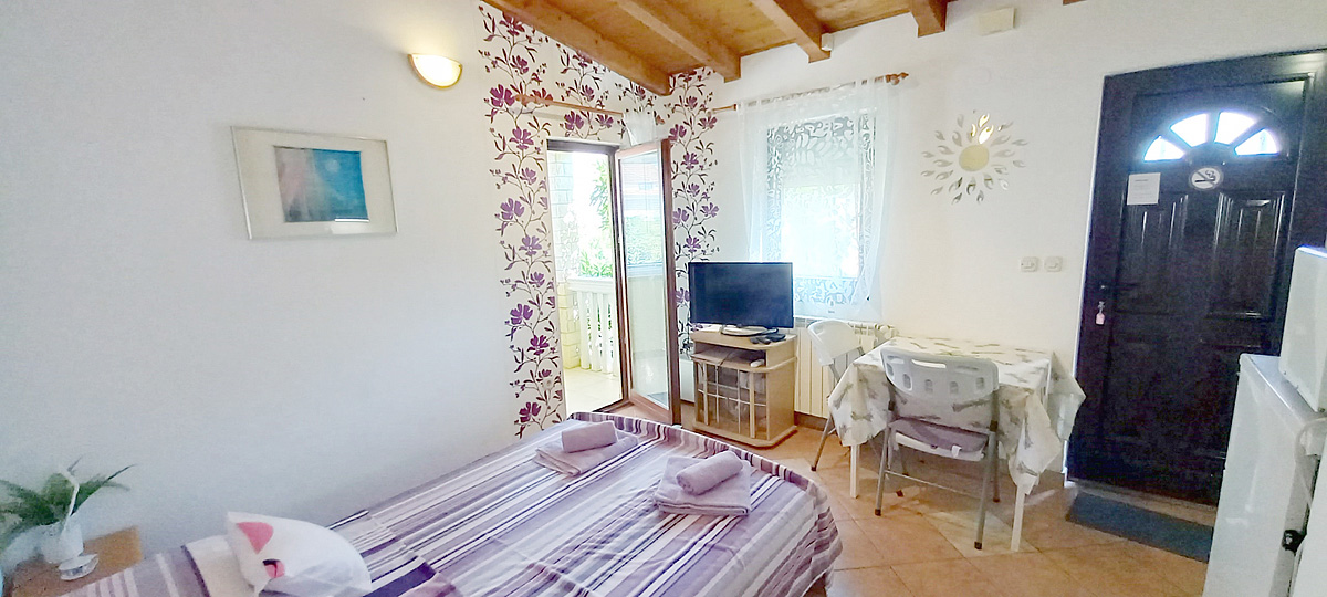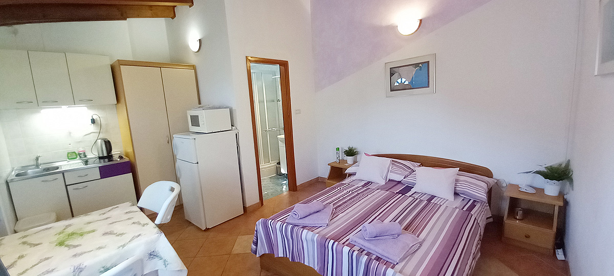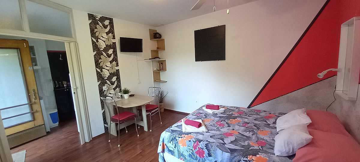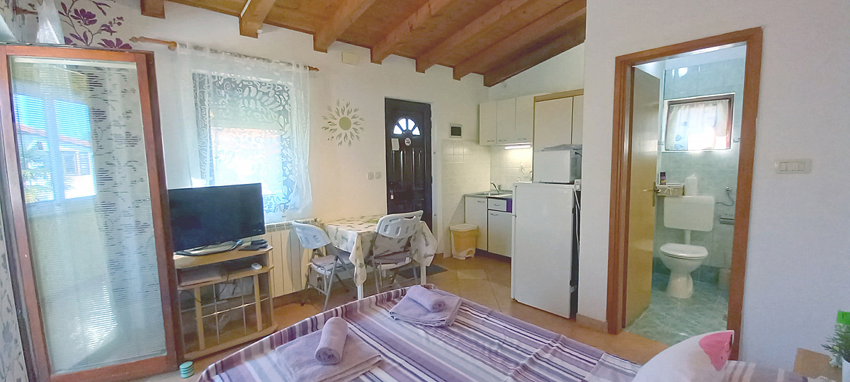 1 ložnice s manželskou postelí, vstupní místnost s kuchyňským koutem, sociální zařízení se sprchou, malá terasa