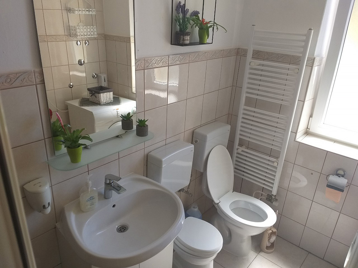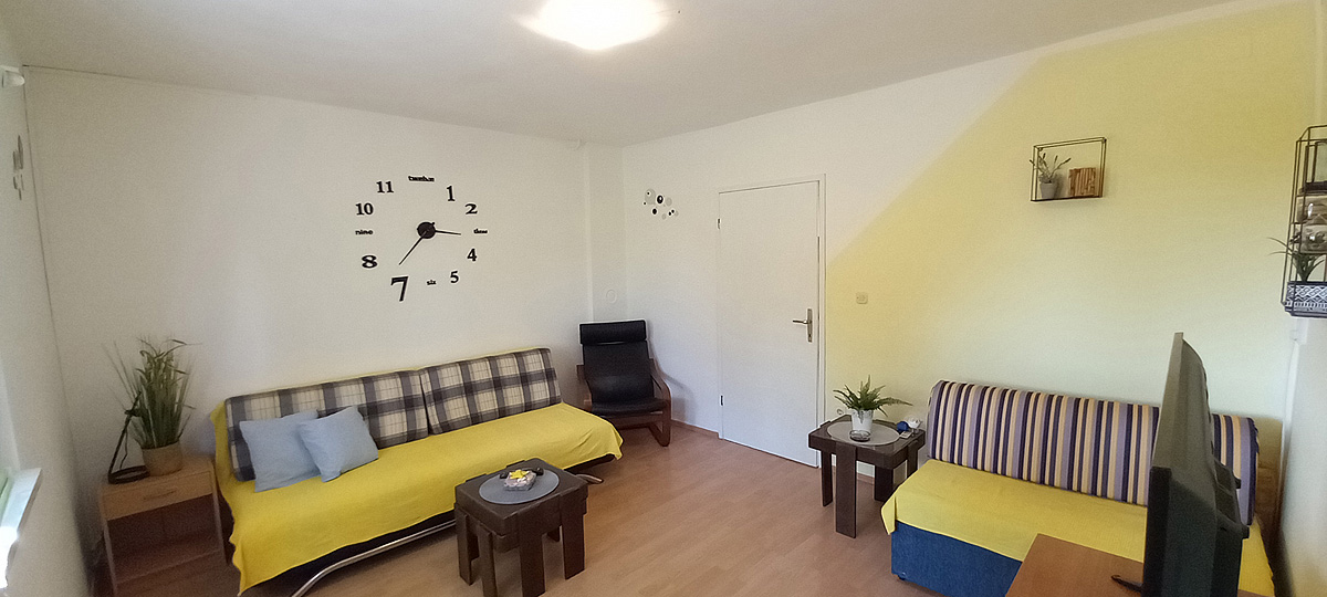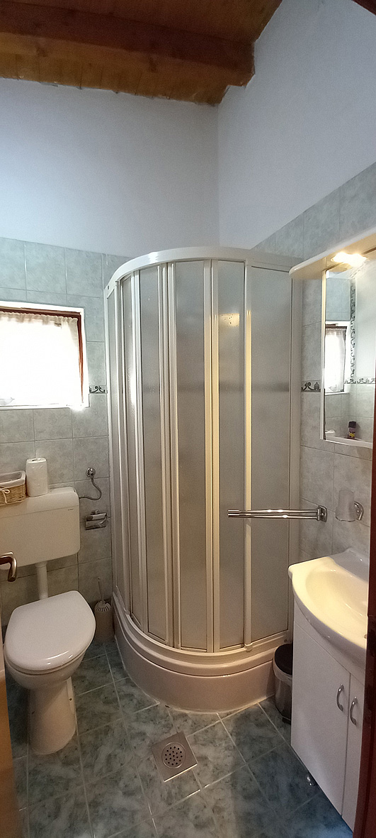 1. patro - 1 ložnice s manželskou postelí, obývací pokoj s rozkládací postelí pro 2 osoby a 1 samostatným lůžkem, kuchyň, sociální zařízení se sprchou a prostorná terasa
