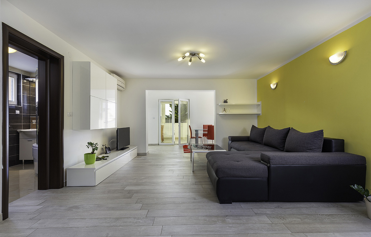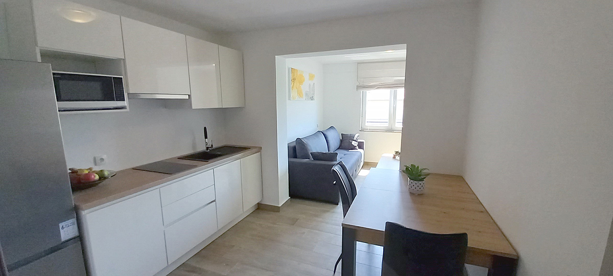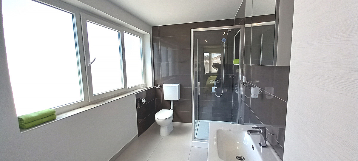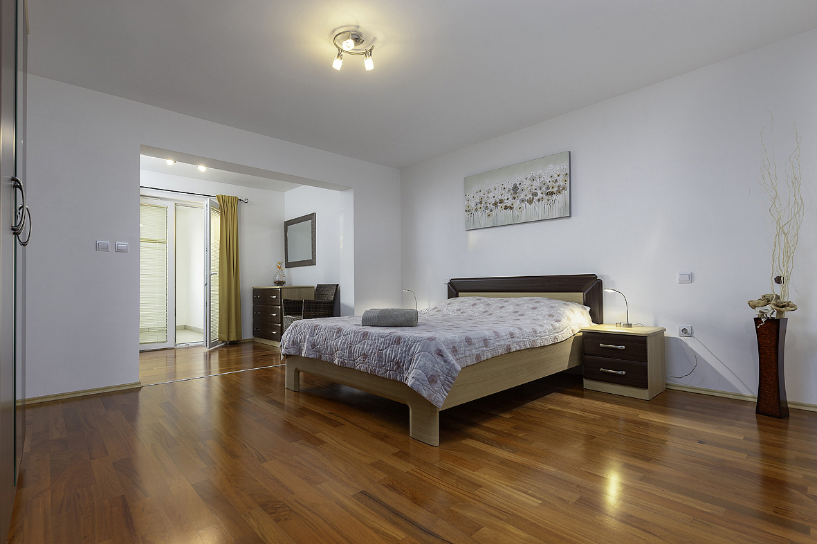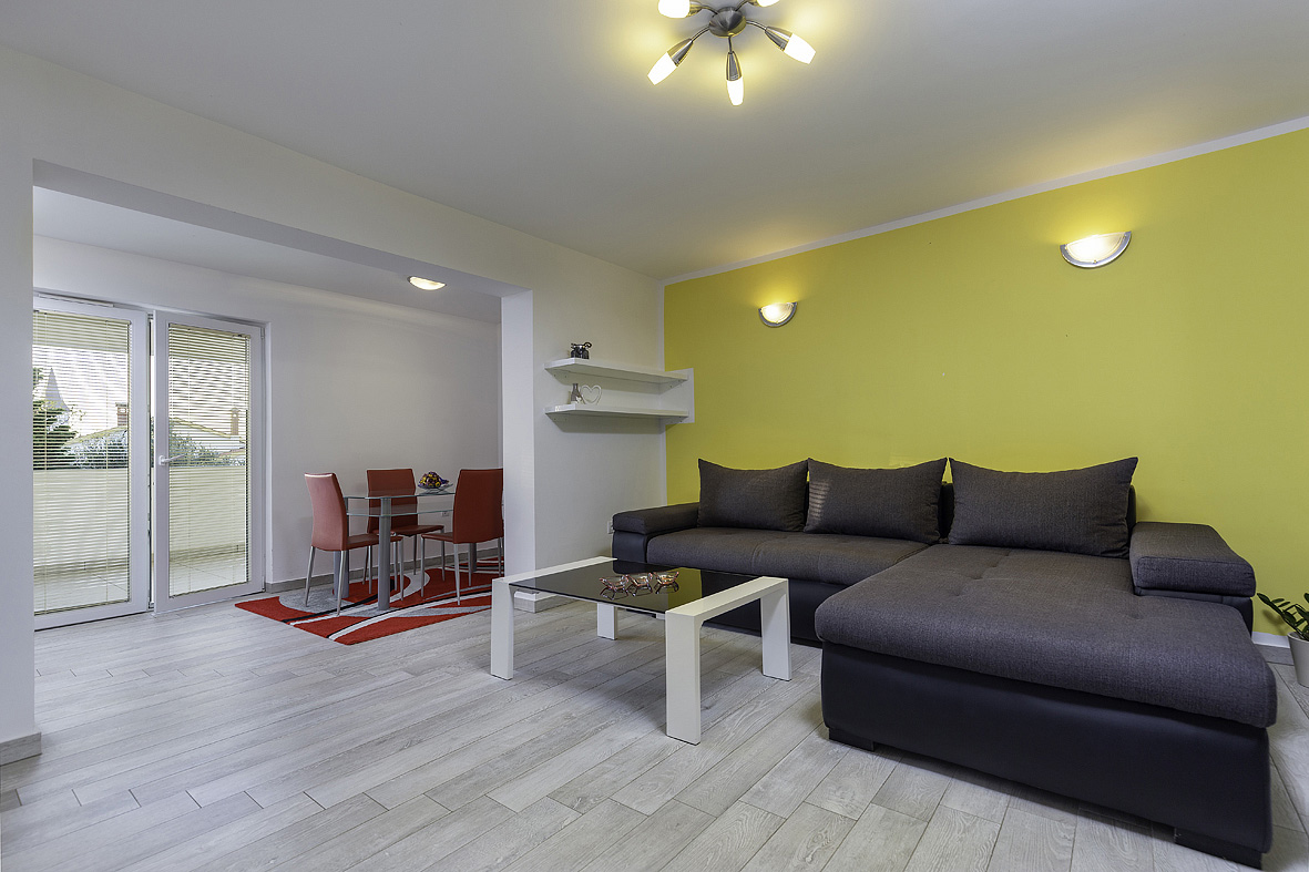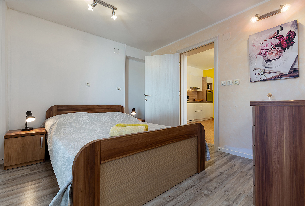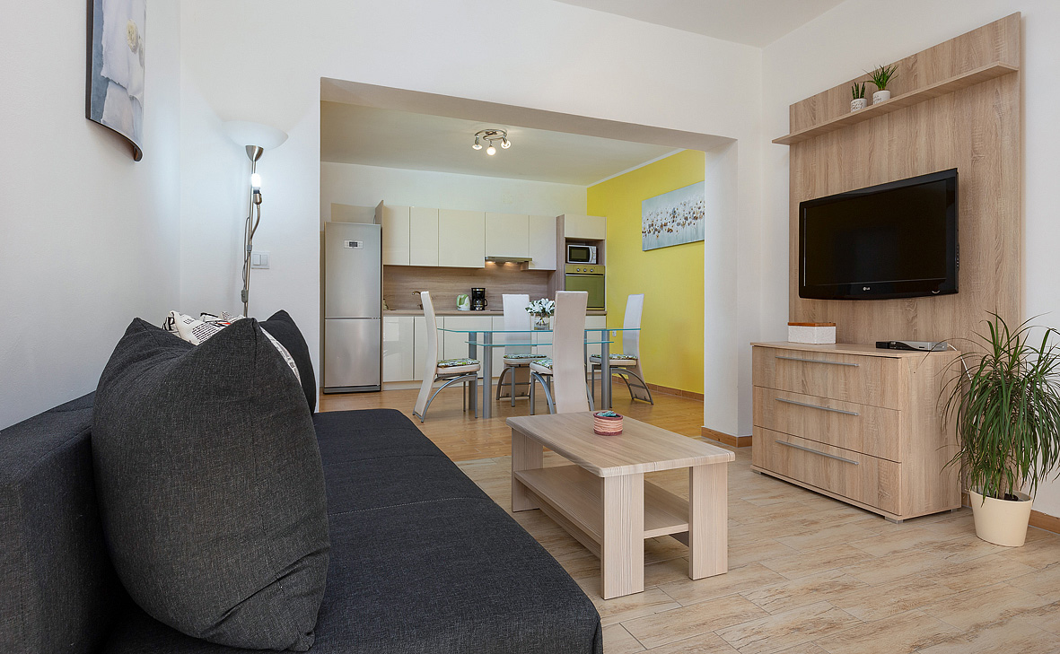 2. patro: moderní apartmán s 1 ložnicí s manželskou postelí, obývací pokoj s rozkládací postelí pro 2 osoby a vybaveným kuchyňským koutem, sociální zařízení se sprchou či vanou, balkon