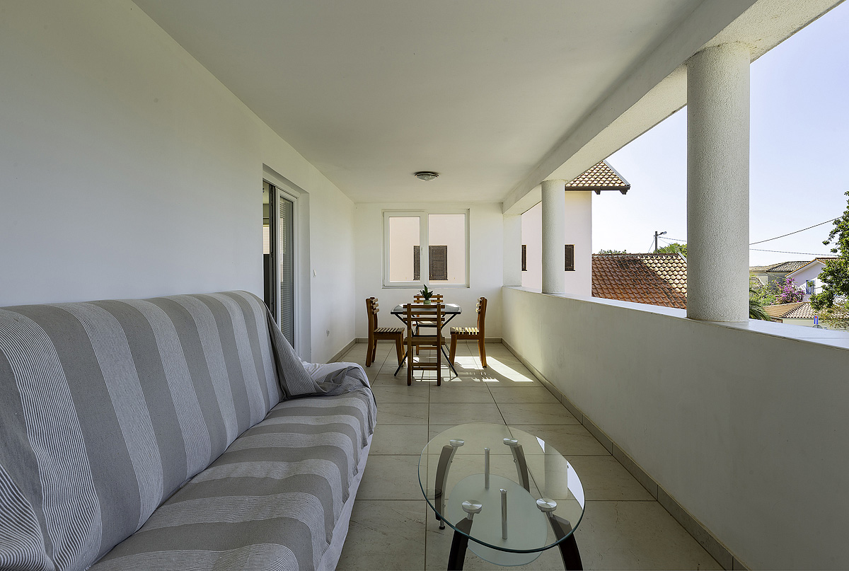 1. patro: apartmán se 2 ložnicemi s manželskou postelí, obývací pokoj s rozkládací postelí pro 2 osoby a vybaveným kuchyňským koutem, sociální zařízení se sprchou či vanou, terasa s posezením, balkon s gaučem