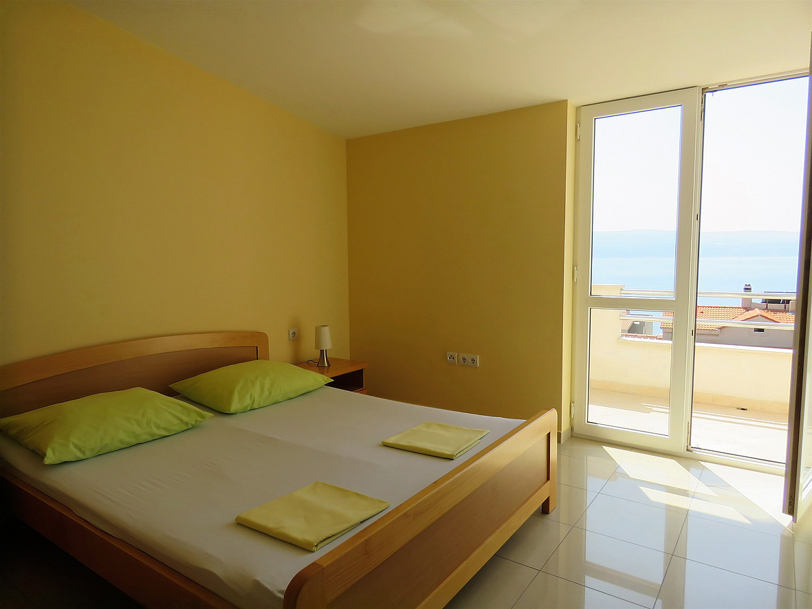 ložnice s manželskou postelí, obývací pokoj s kuchyňským koutem a rozkládacím gaučem pro 2 osoby, sociální zařízení se sprchou, balkon s výhledem na moře