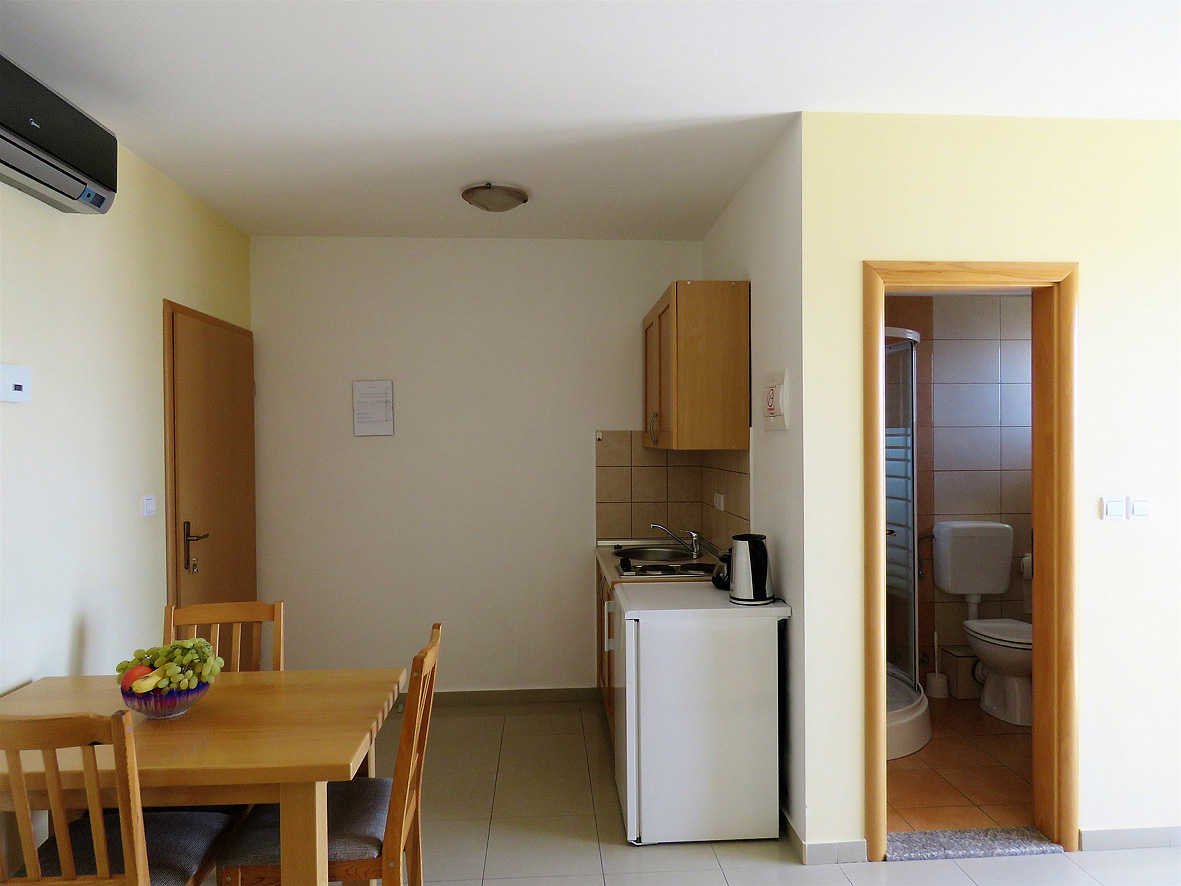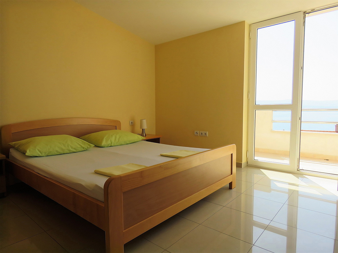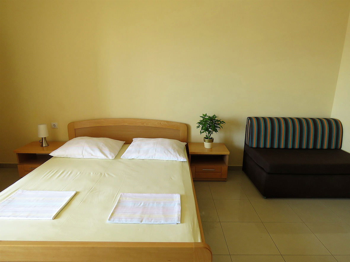 obývací pokoj s kuchyňským koutem a manželskou postelí, sociální zařízení se sprchou, možnost 1 přistýlky formou rozkládacího gauče, balkon s výhledem na moře