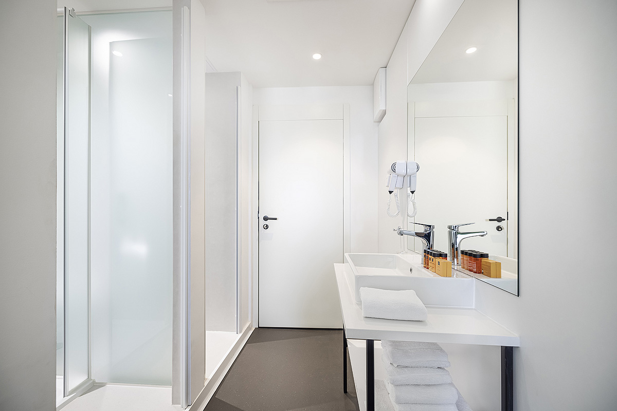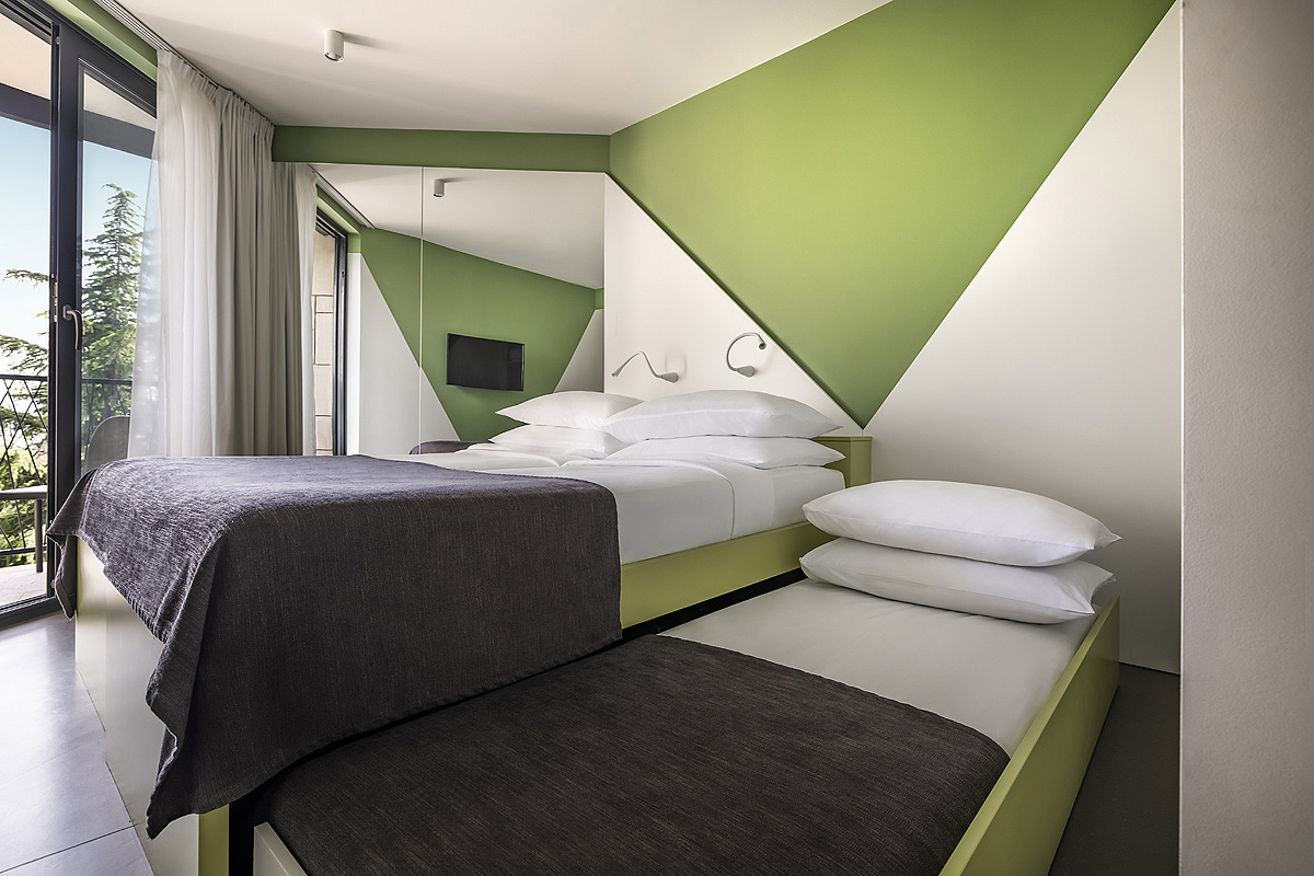 Comfort 2+1 balkon - cca 18 m² - pokoj s manželskou postelí a přistýlkou formou vysouvacího lůžka pro dítě do nedovršených 15 let, sociální zařízení se sprchou, balkon s výhledem na park