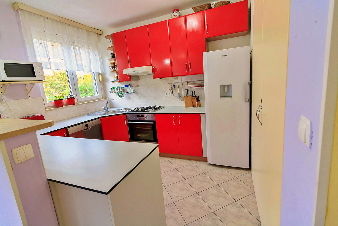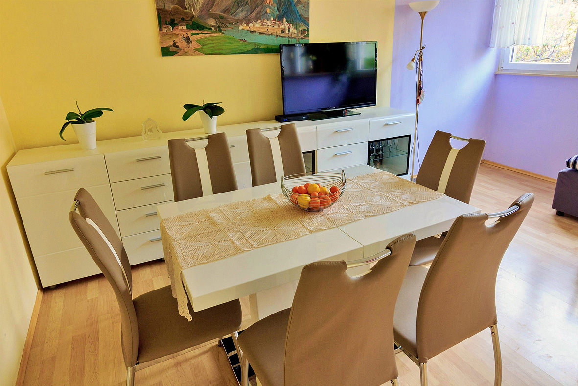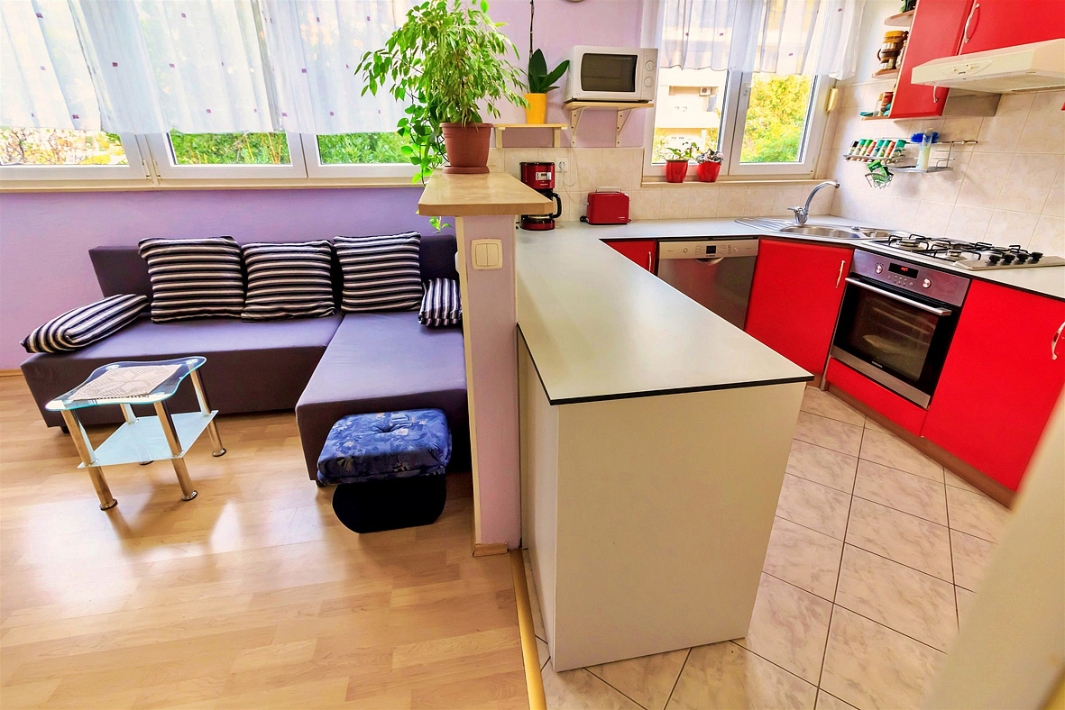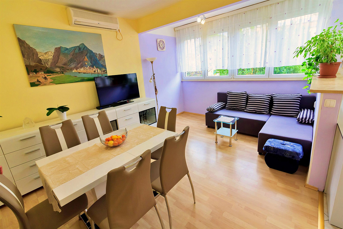 2x pokoj s manželskou postelí, obývací pokoj s kuchyňským koutem a rozkládací gauč pro 2 osoby, sociální zařízení s vanou, balkon