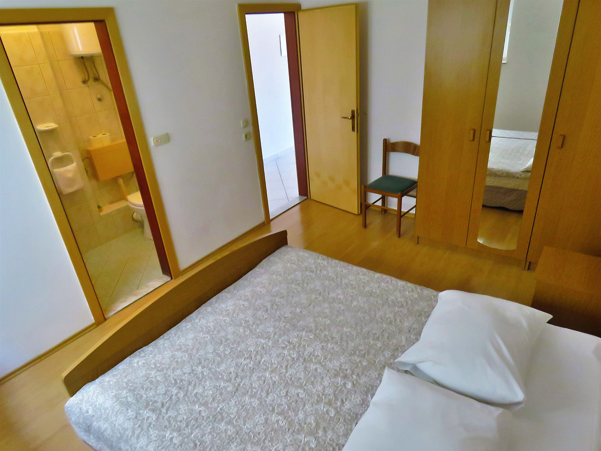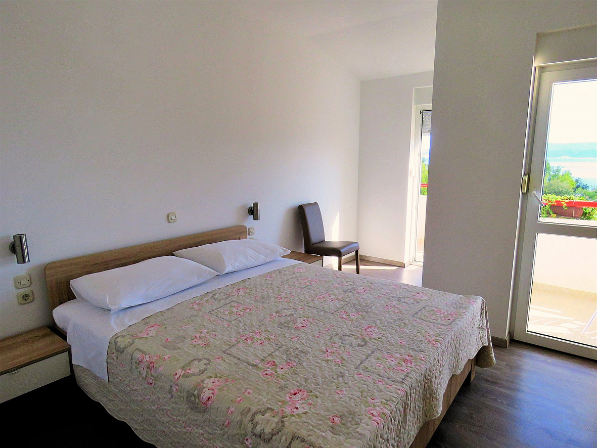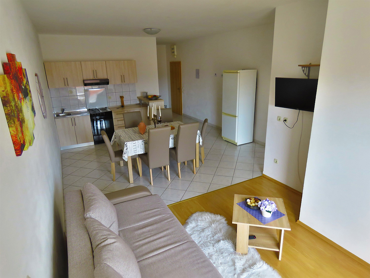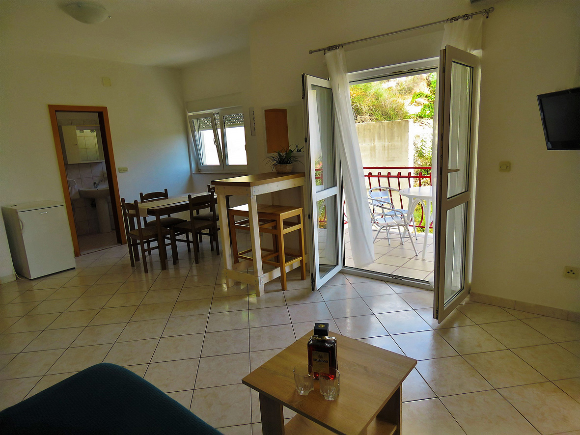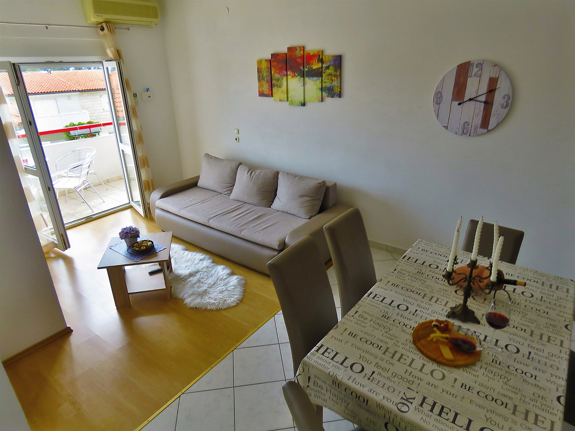 pokoj s manželskou postelí, obývací pokoj s kuchyňským koutem a rozkládacím gaučem pro 2 děti do nedovršených 15 let, sociální zařízení se sprchou, 2x balkon, jeden s výhledem na moře