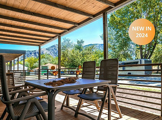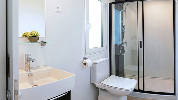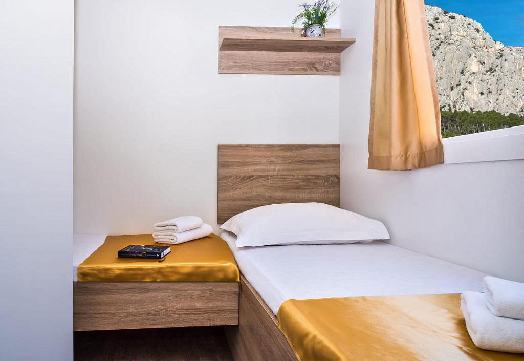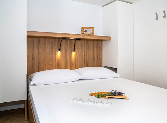24 m² – ložnice s manželskou postelí, pokoj se dvěma oddělenými lůžky, obývací pokoj s kuchyňským koutem (varná deska, lednice, nádobí, kávovar) a pohovkou pro 2 děti do nedovršených 12 let, sociální zařízení se sprchou, zastřešená terasa