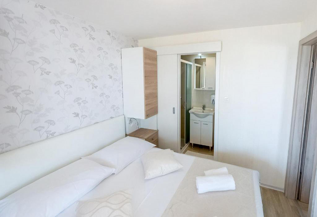 34 m² - ložnice s manželskou postelí, pokoj s dvěma oddělenými lůžky, obývací pokoj s kuchyňským koutem (varná deska, lednice, kávovar) a pohovkou pro dítě do nedovršených 12 let, 2x sociální zařízení se sprchou, zastřešená terasa s posezením, umístění v poslední řadě nejdále od moře