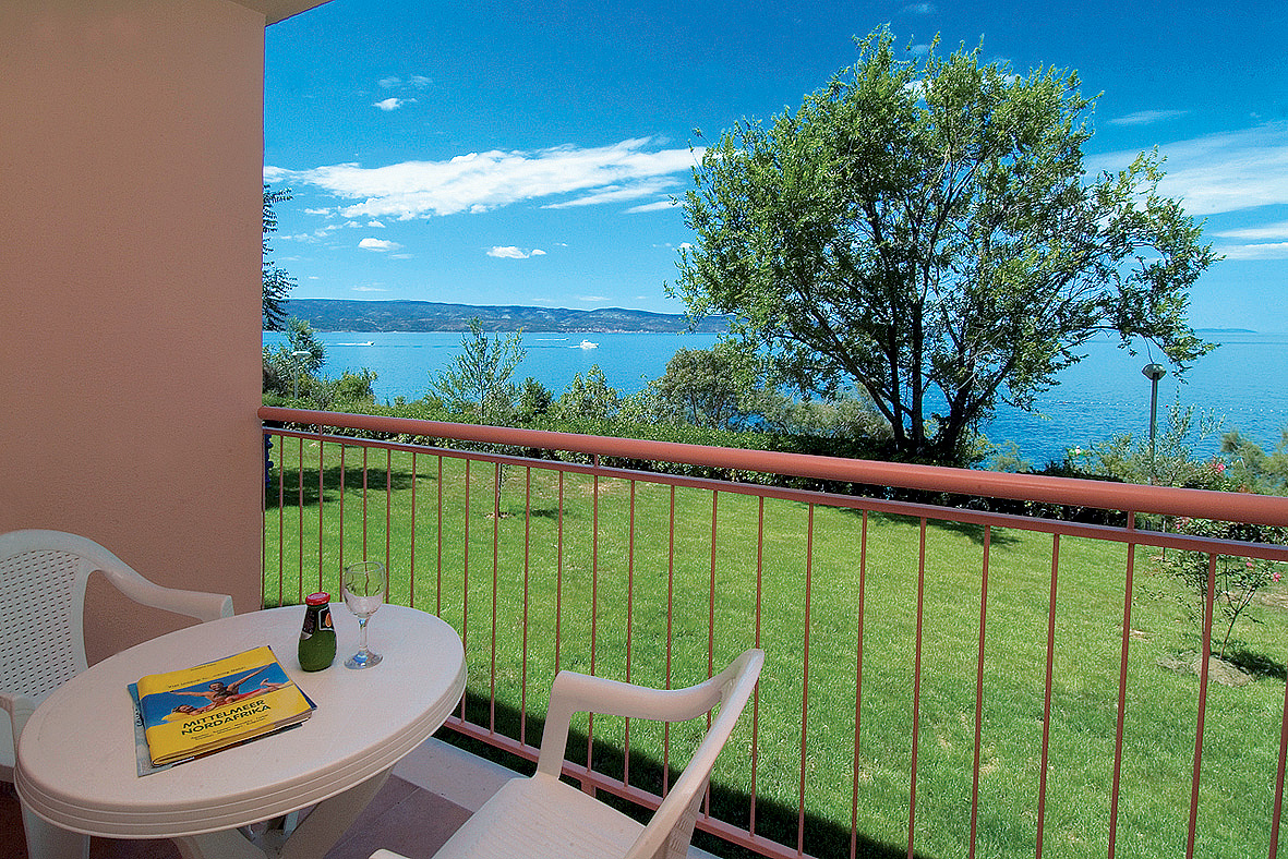 pokoj s manželskou postelí, sociální zařízení se sprchou, přistýlka formou rozkládacího křesla pro dítě do nedovršených 12 let, balkon orientovaný k moři