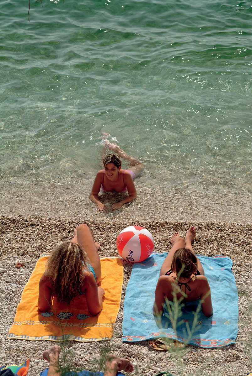 poloha ve stínu borového háje jen přes ulici od moře s pozvolně se svažující pláží