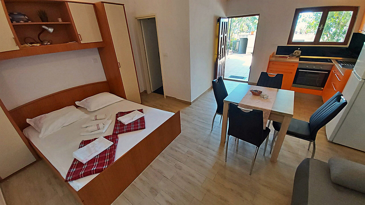 obývací pokoj s kuchyňským koutem a manželskou postelí, sociální zařízení, balkon s výhledem na moře