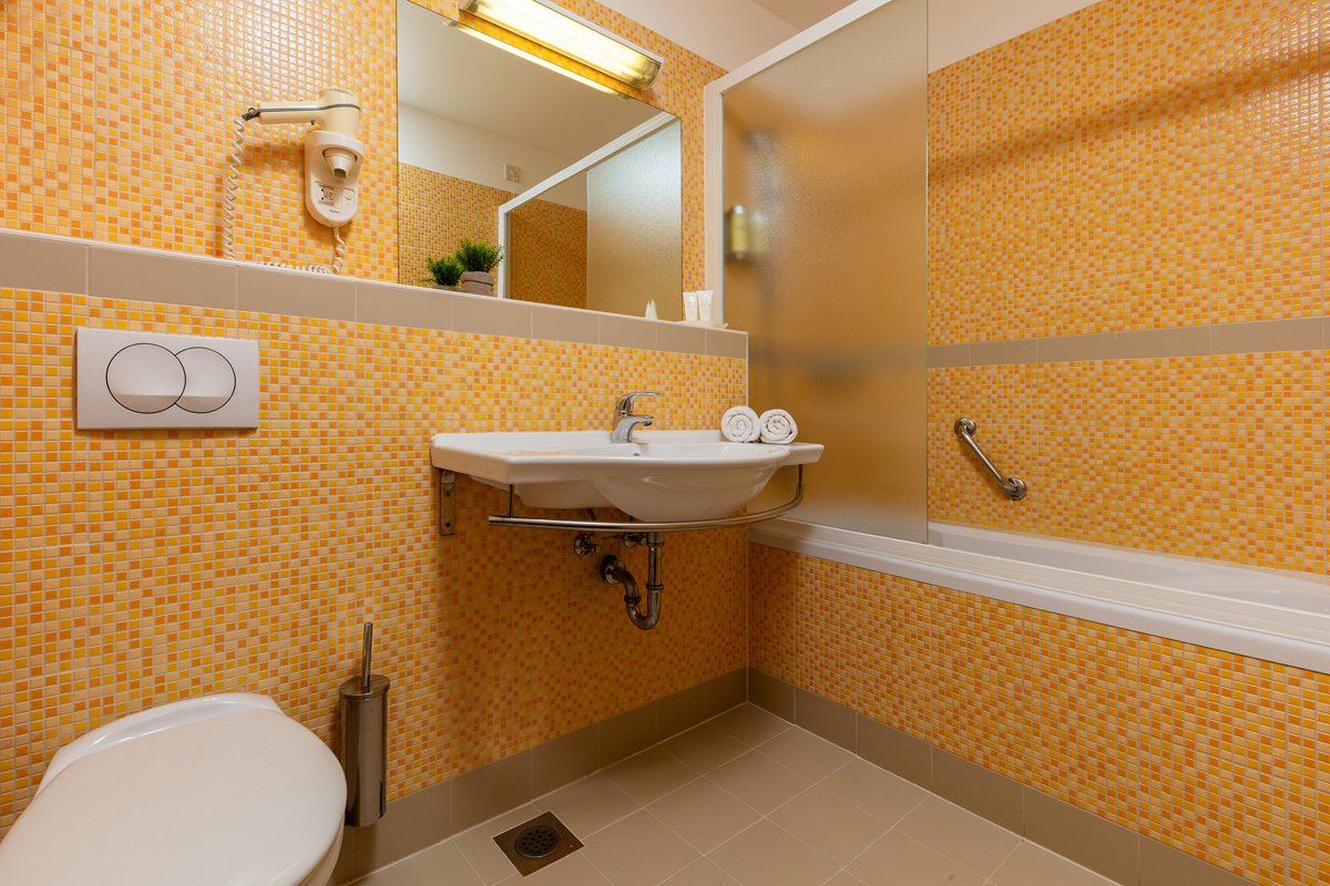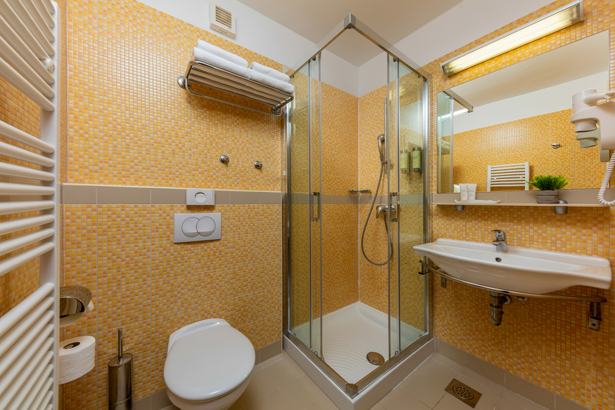 20 m², pokoj s manželskou postelí nebo dvěma oddělenými lůžky v jasných a světlých tónech, ideální pro páry, sociální zařízení se sprchou, balkon s výhledem na borovicový les a tenisové kurty