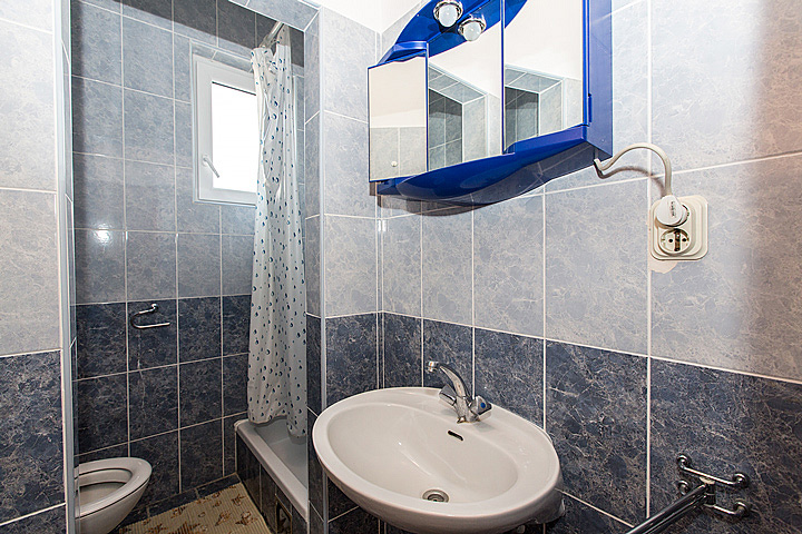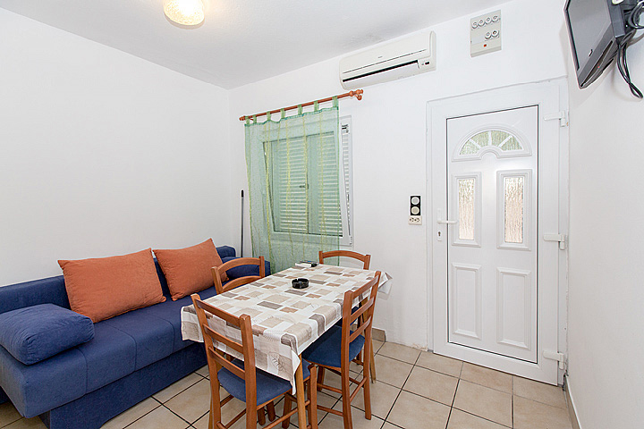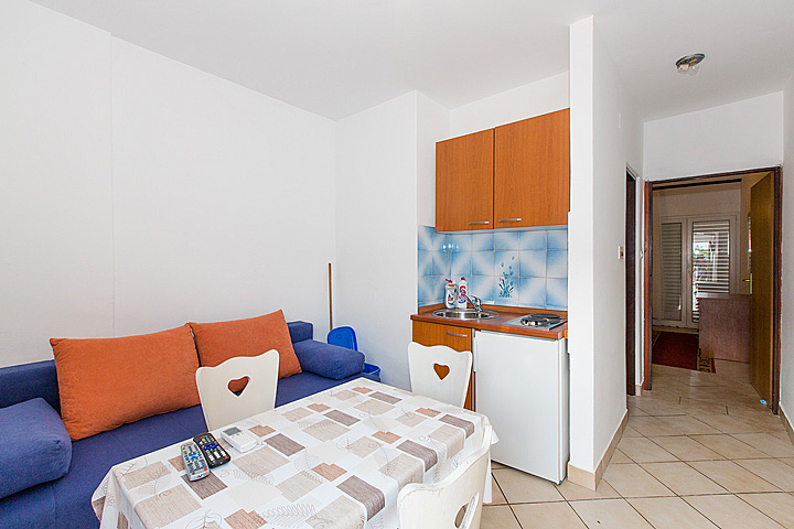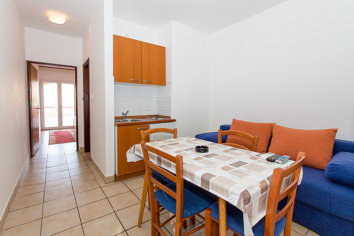 ložnice s manželskou postelí, obývací pokoj s kuchyňským koutem, jídelním stolem a rozkládacím gaučem pro 2 děti do nedovršených 12 let, sociální zařízení, balkon s výhledem na moře