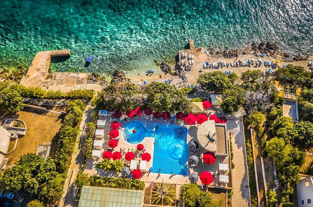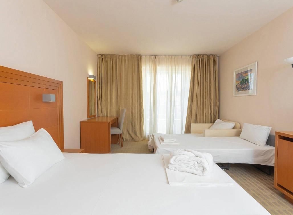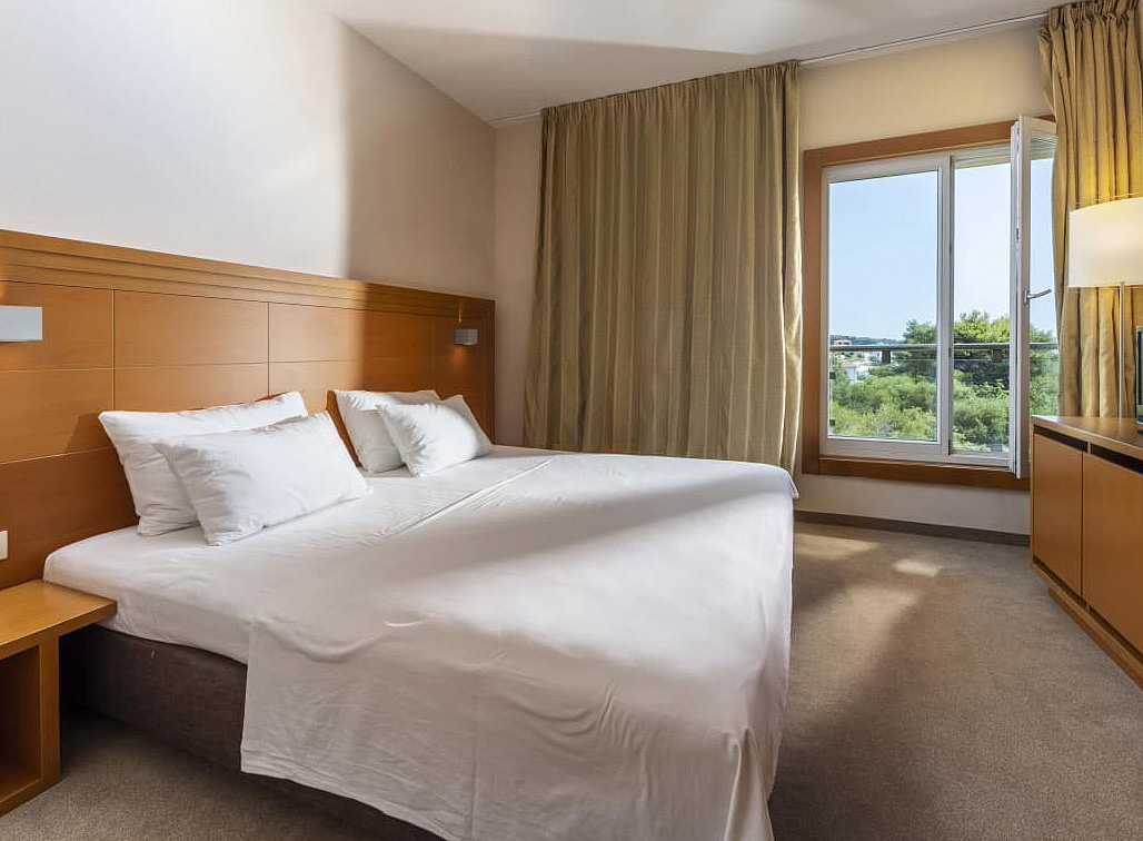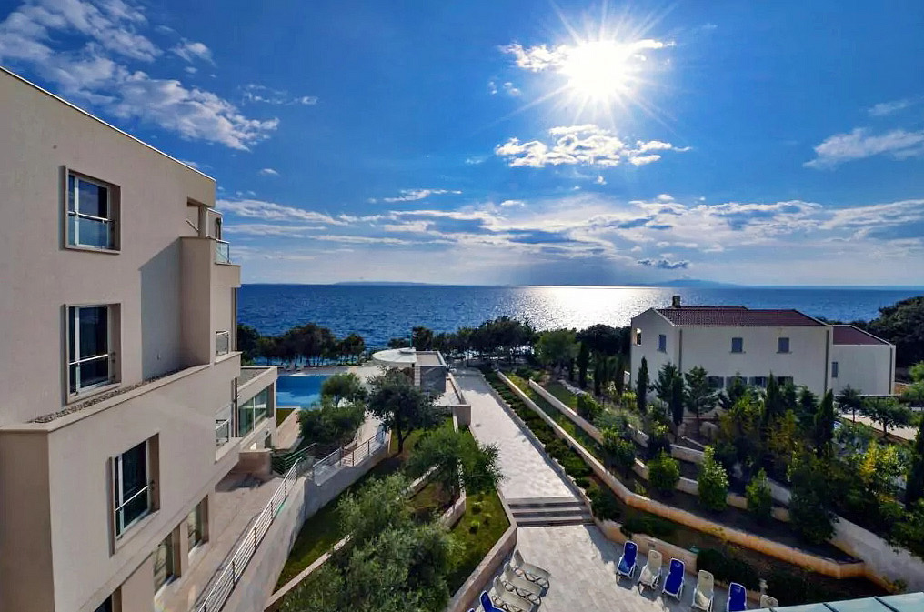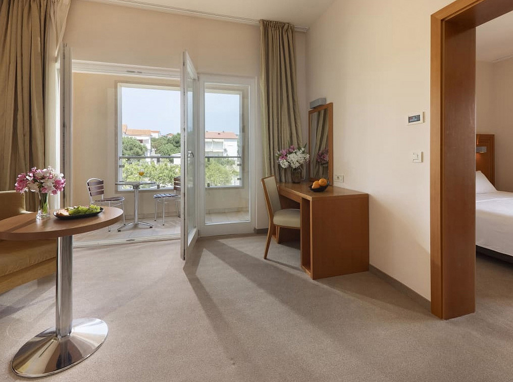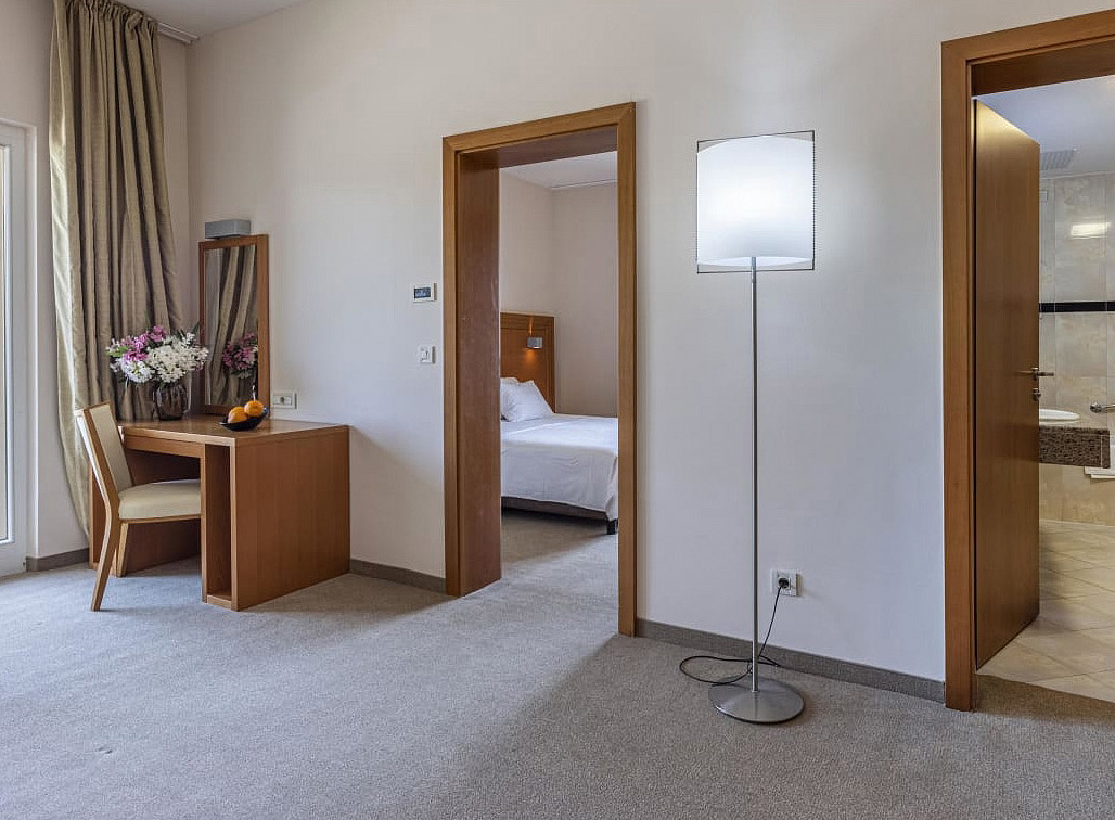 cca 45 m² - propojený pokoj se dvěma manželskými postelemi a možností až dvou přistýlek (každá v jednom pokoji) formou rozkládacího lůžka, sociální zařízení s vanou, balkon s pohledem na moře