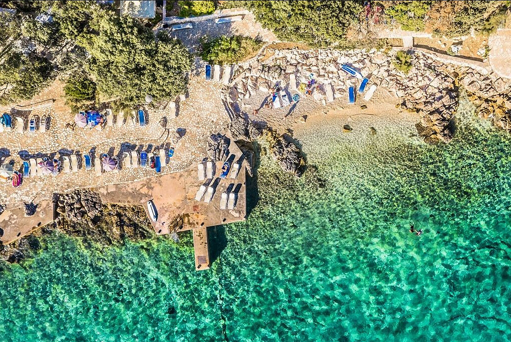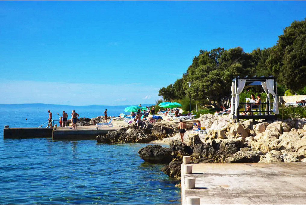 Ostrov Pag, Jakišnica - 1,5 km, Lun - 6 km, Novalja - 16 km; pláž / kamenitá s betonovými platy - 30 m