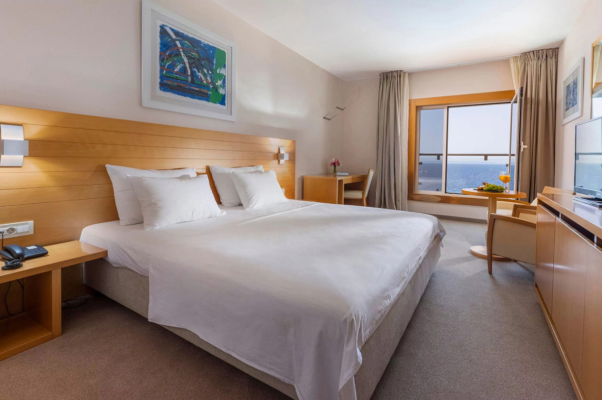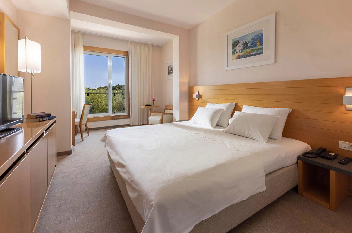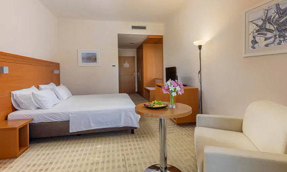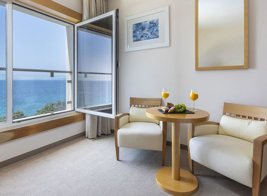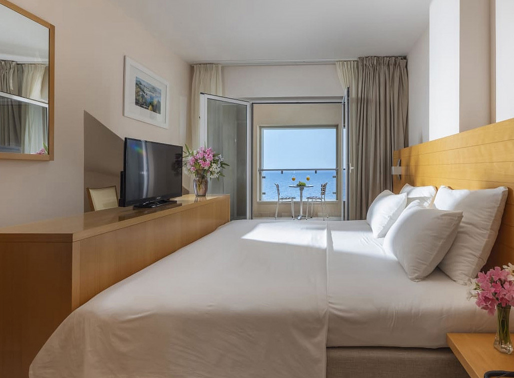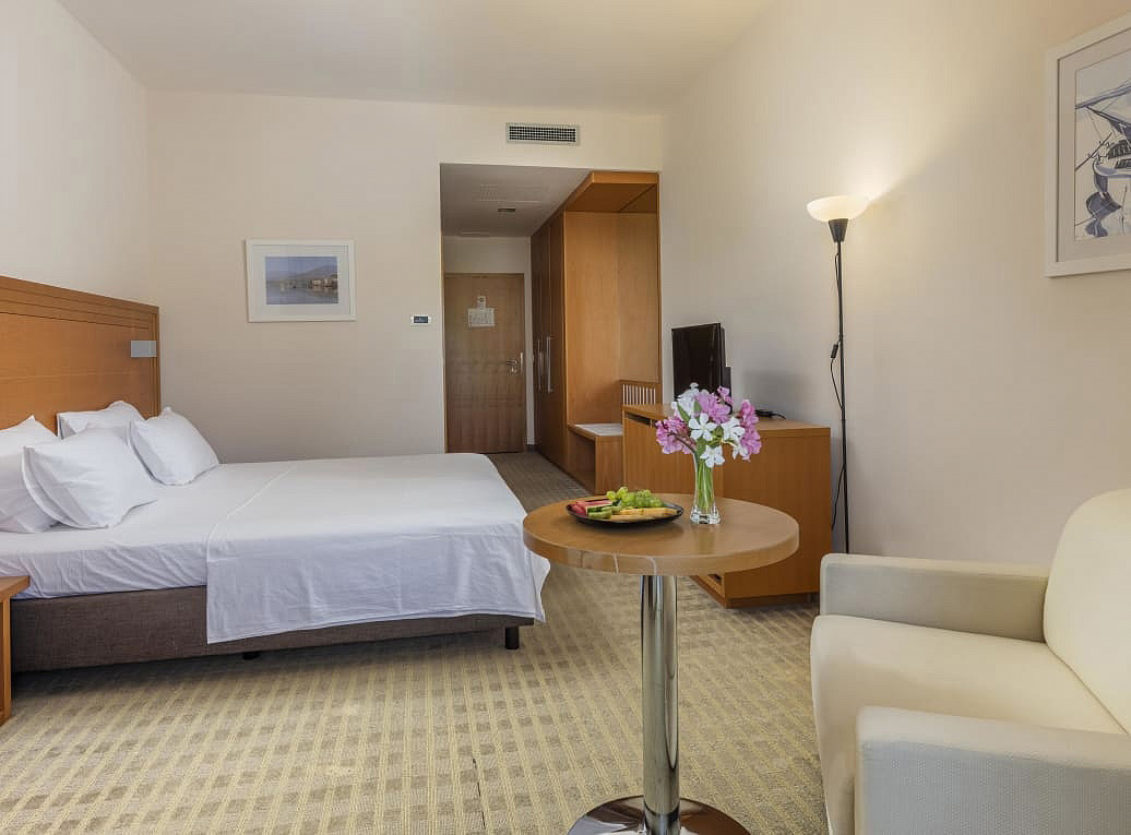 cca 23 m² - 28 m² - pokoj s manželksou postelí a pomocným lůžkem, sociální zařézení s vanou, pohled na moře