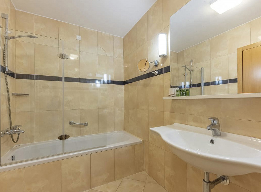 cca 31 m² - pokoj s manželskou postelí a dvěma rozkládacími křesly (190x70 cm), s možností ubytování pro 4 dospělé osoby, sociální zařízení s vanou, výhled na park