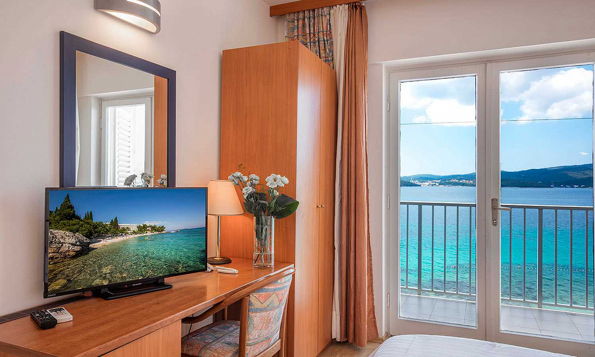 pokoj s manželskou postelí či dvěma oddělenými lůžky s možností přistýlky pro 3. osobu, sociální zařízení se sprchou či vanou, balkon s výhledem na moře