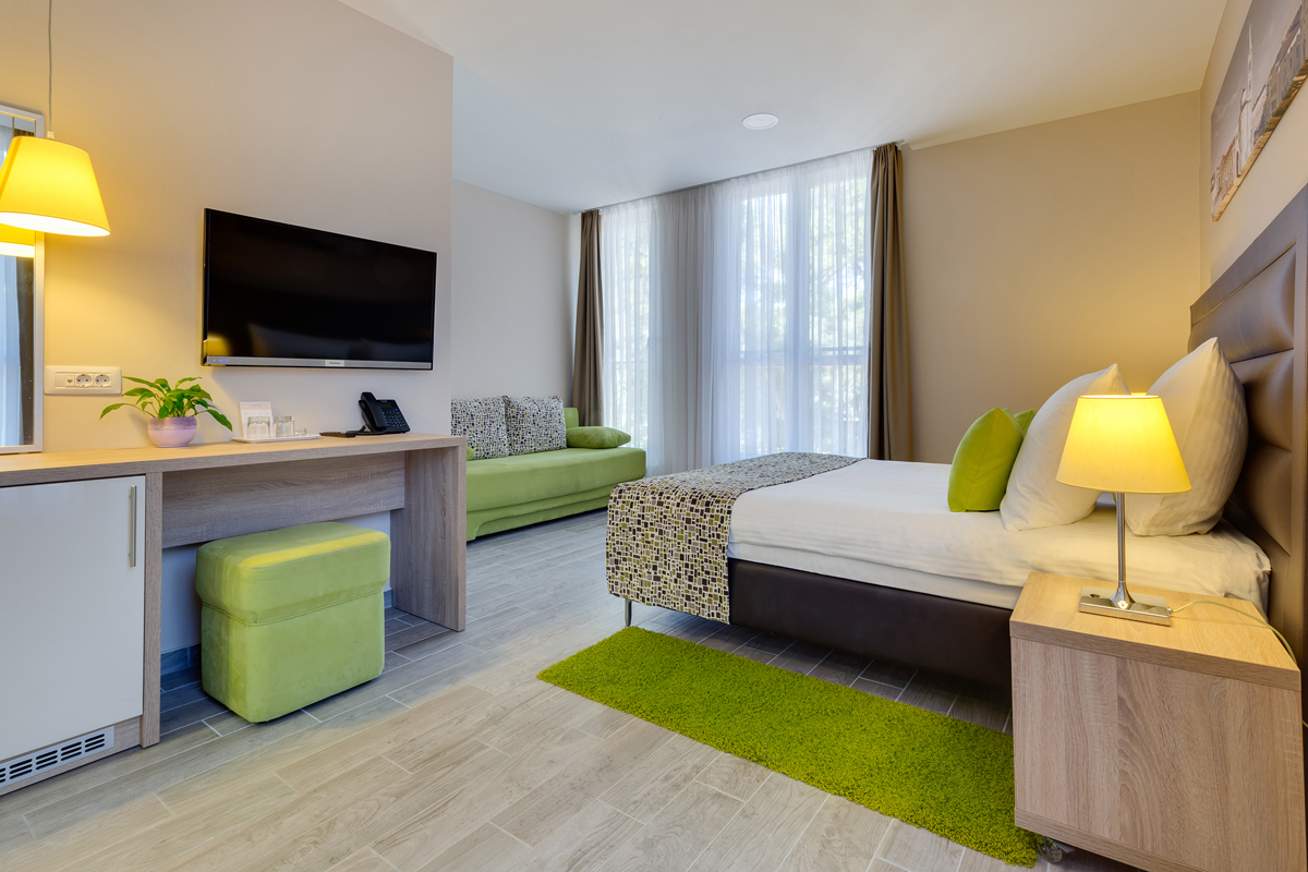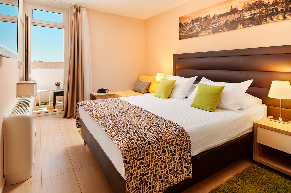 Premium 2+1 balkon - 22 m², pokoj s manželskou postelí nebo dvěma oddělenými lůžky s možností přistýlky formou rozkládacího gauče pro dítě do nedovršených 16 let, sociální zařízení se sprchou, balkon