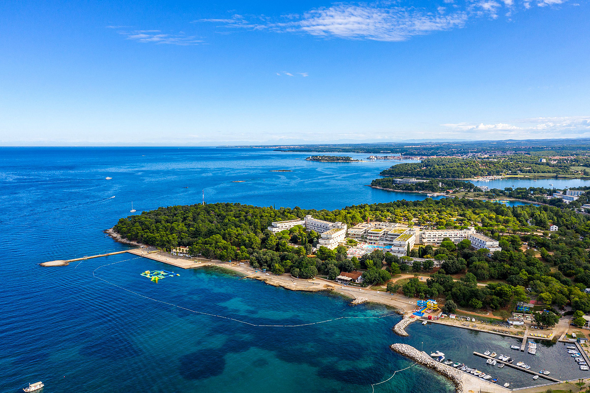 Hotel Delfin se nachází na poloostrově v místě zvaném Zelena Laguna; pláž získala prestižní ocenění MODRÁ VLAJKA, která se uděluje za vybavení pláže a čistotu moře