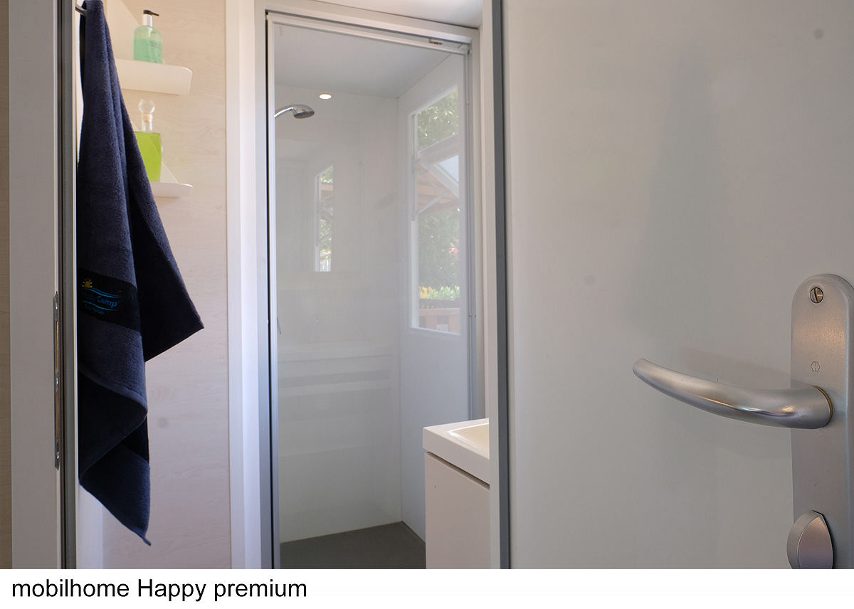 ložnice s manželskou postelí, 2 ložnice se 2 samostatnými lůžky, obývací pokoj s rozkládací lavicí, která představuje přistýlku, sociální zařízení se sprchou, v některých mobilehome je oddělená toaleta, krytá terasa se zahradním nábytkem, k dispozici je reproduktor na Bluetooth