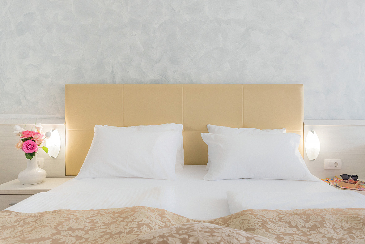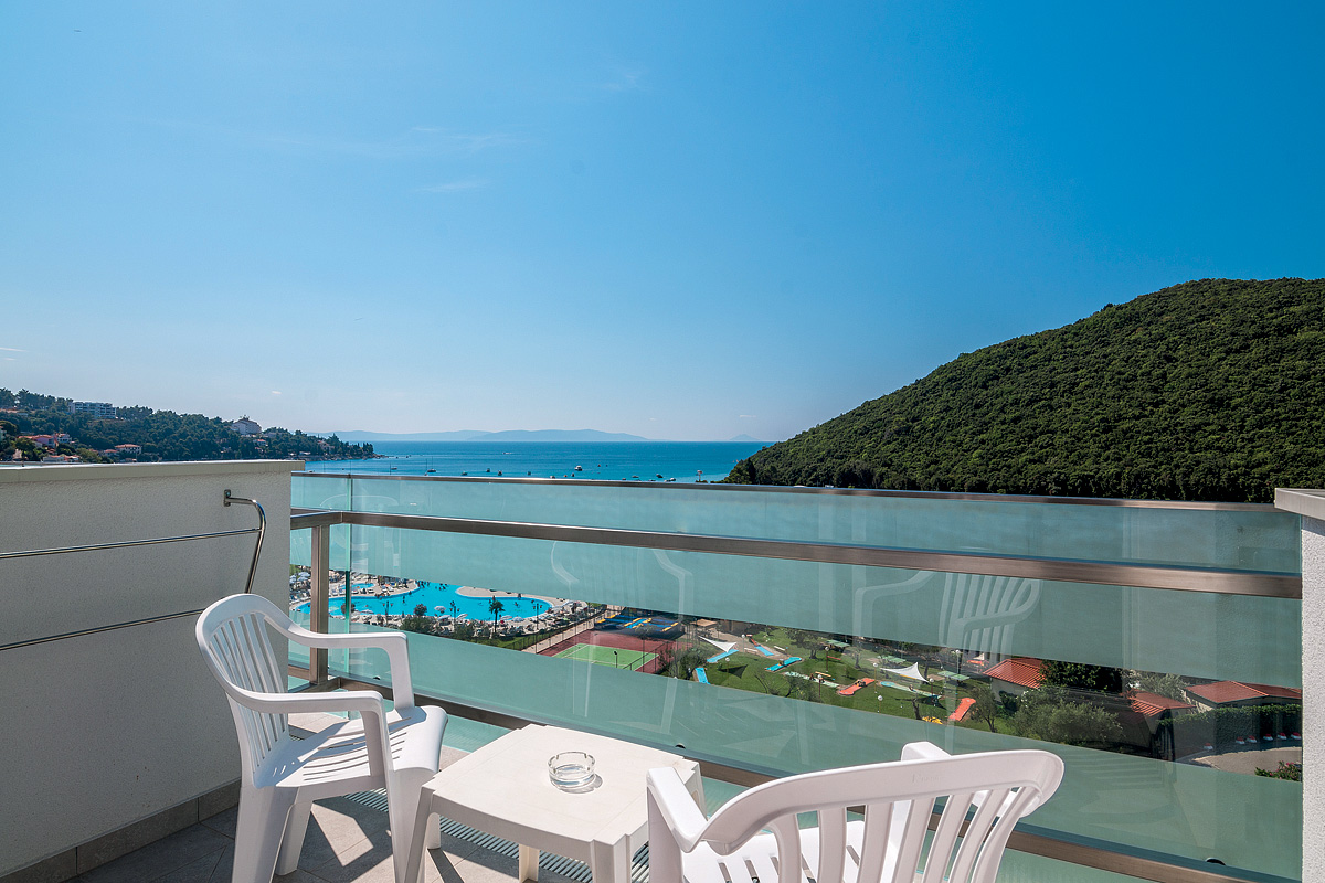 pokoj pro 4 osoby s manželskou postelí nebo dvěma oddělenými lůžky, rozkládací pohovka pro 2 děti do nedovršených 18 let nebo jednu dospělou osobu, sociální zařízení se sprchou, balkon orientovaný na moře