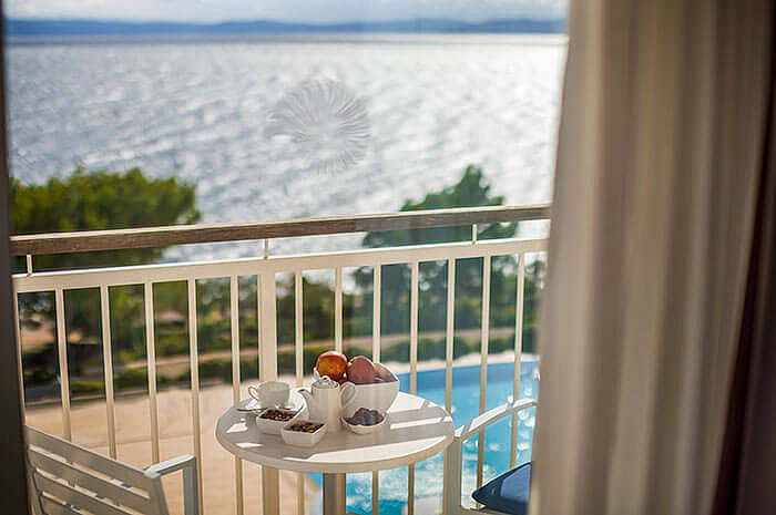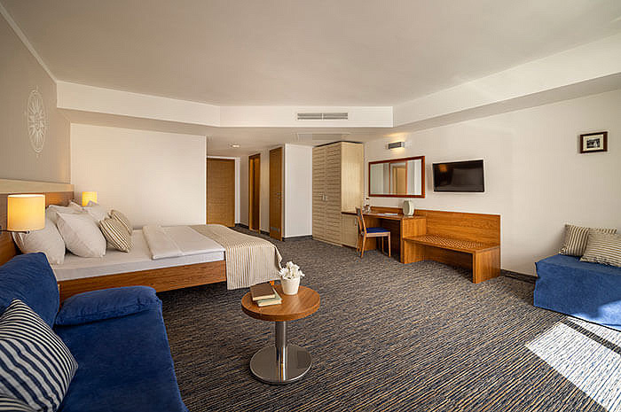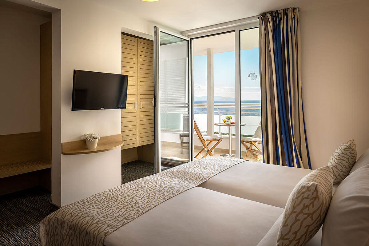 Superior 2+1 - 23 m² - pokoj s manželskou postelí či 2 samostatnými lůžky, 3. lůžko formou přistýlky pro děti do nedovršených 12 let, sociální zařízení se sprchou nebo vanou, balkon s výhledem na moře