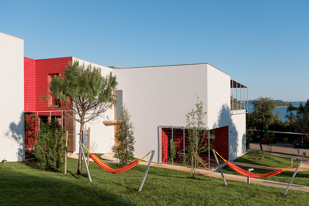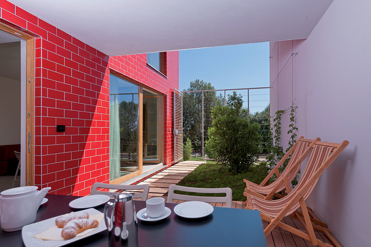 66 m² - mezonet - 1. podlaží: obývací pokoj s kuchyňským koutem a rozkládacím gaučem pro 1 dospělou osobu či 2 děti do nedovršených 7 let, WC; 2. podlaží: ložnice s manželskou postelí, ložnice s 2 oddělenými lůžky, sociální zařízení se sprchou; lodžie se zahradou