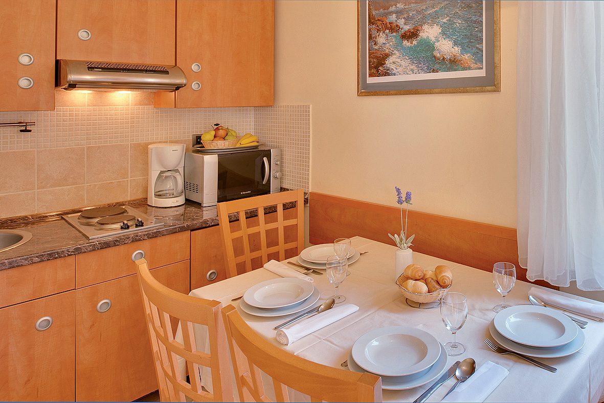 klimatizace, TV sat., telefon, wi-fi připojení k internetu, trezor, fén, mikrovlnka, kávovar; trouba a myčka nádobí (pouze u typologie bilo 2+2 a trilo 4+2)