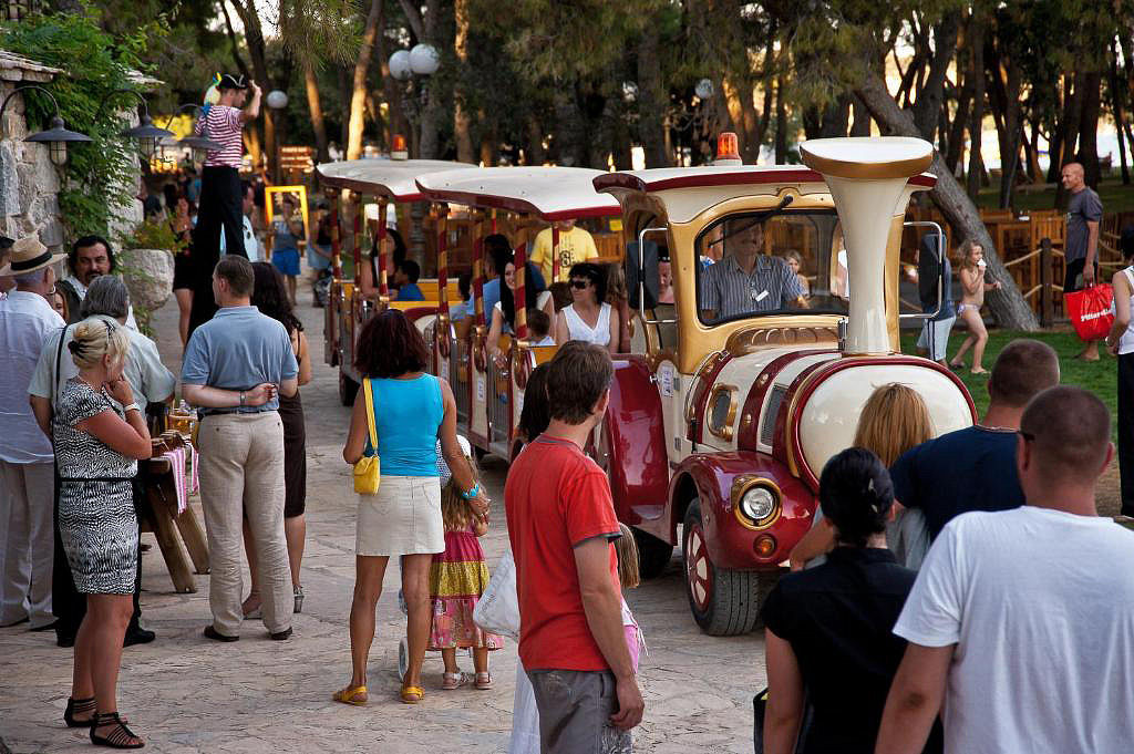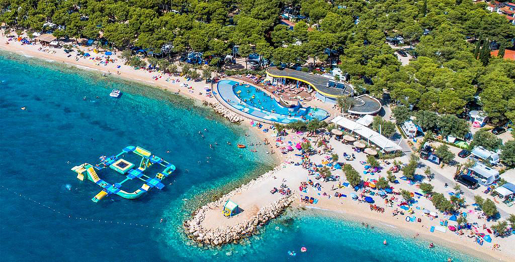 Resort Solaris, pláž / drobné kamínky, místy až hrubší písek s pozvolným vstupem do moře (vhodné i pro velmi malé děti), místy betonové molo s oblázkovým dnem, centrum - 1 km, Trogir - 7 km