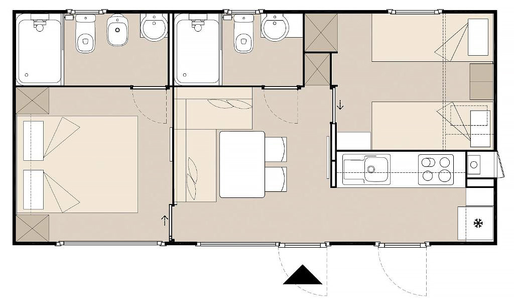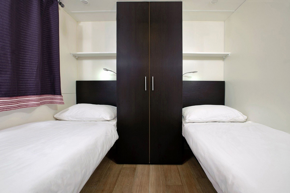 32 m² - 1 ložnice s manželskou postelí, 1 ložnice s dvěma samostatnými lůžky, obývací pokoj s rozkládací pohovkou pro 2 děti do 11 let, sociální zařízení se sprchou, terasa se 6 židlemi a stolem