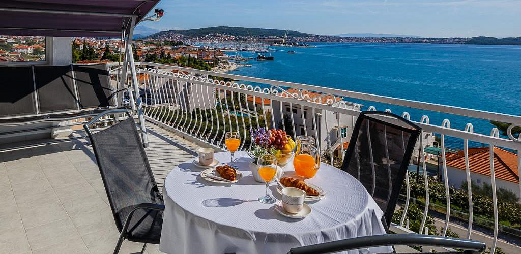 ložnice s manželskou postelí, ložnice se dvěma samostatnými lůžky, obývací pokoj s rozkládací postelí pro 2 děti do nedovršených 12 let a kuchyňským koutem, sociální zařízení se sprchou, balkon s výhledem na moře