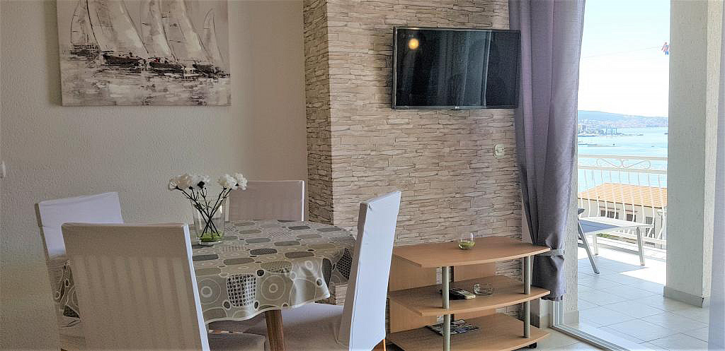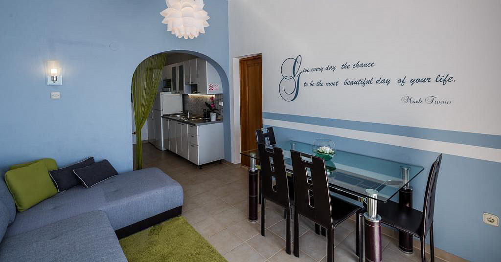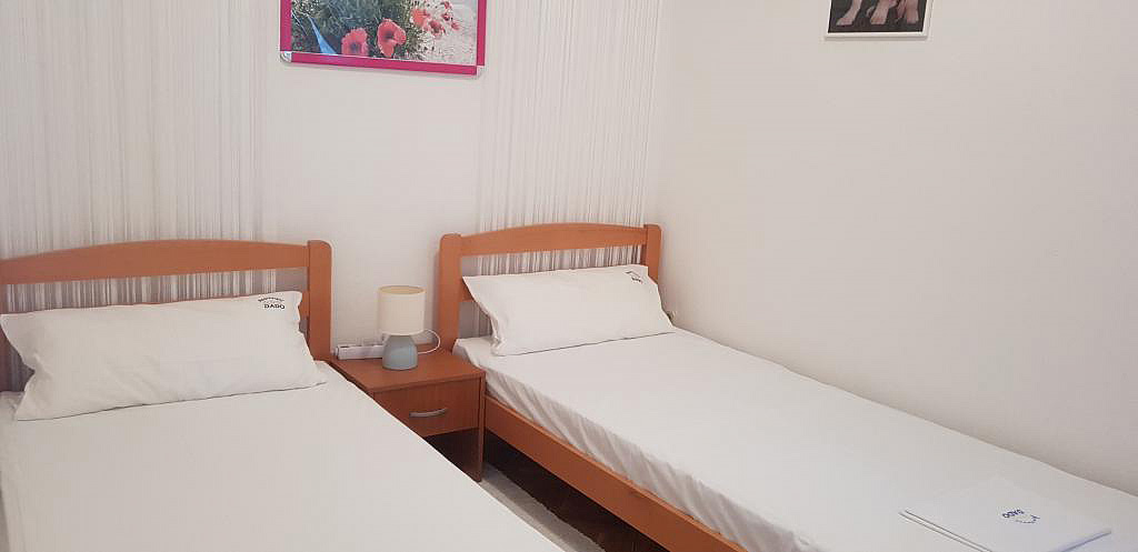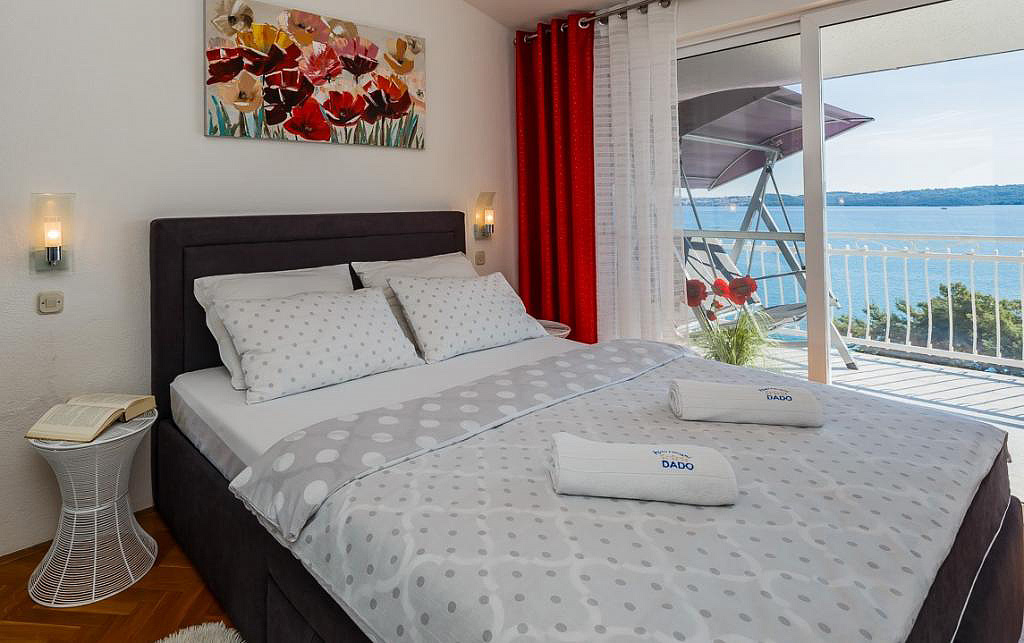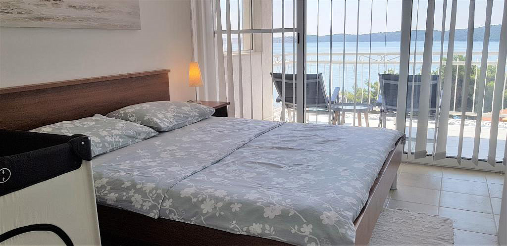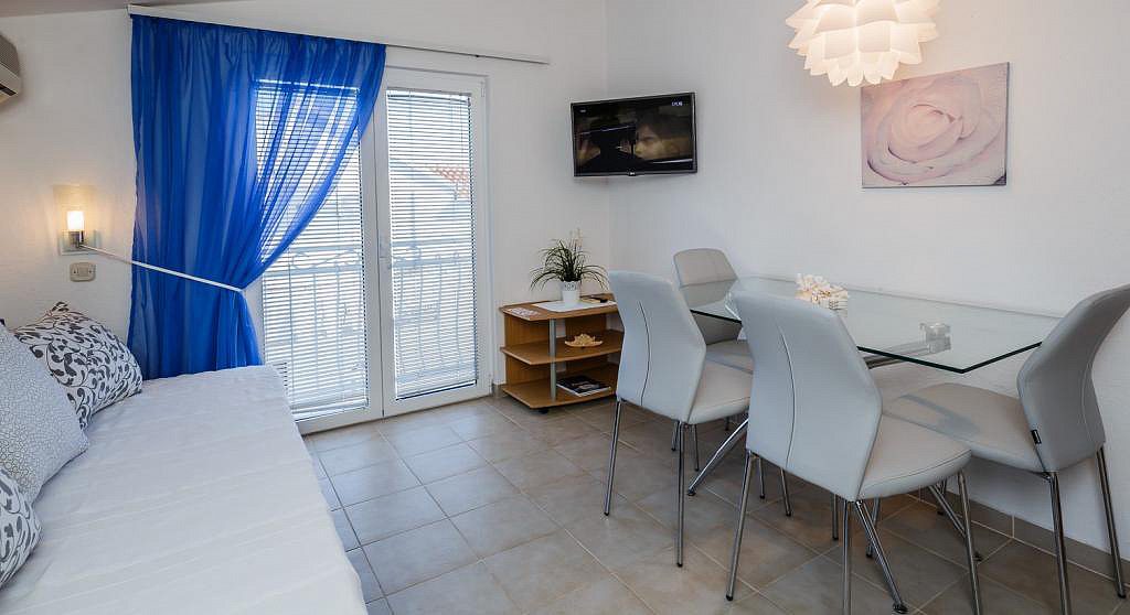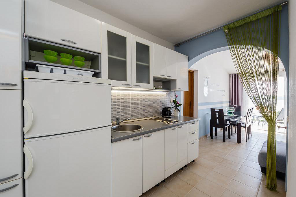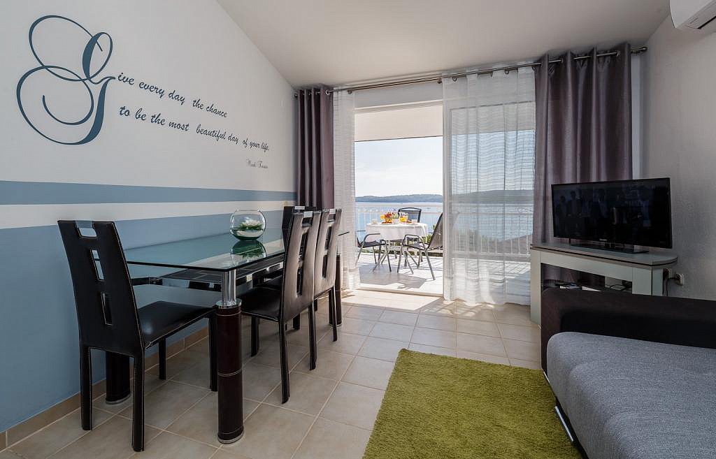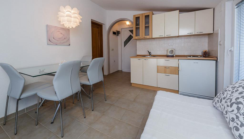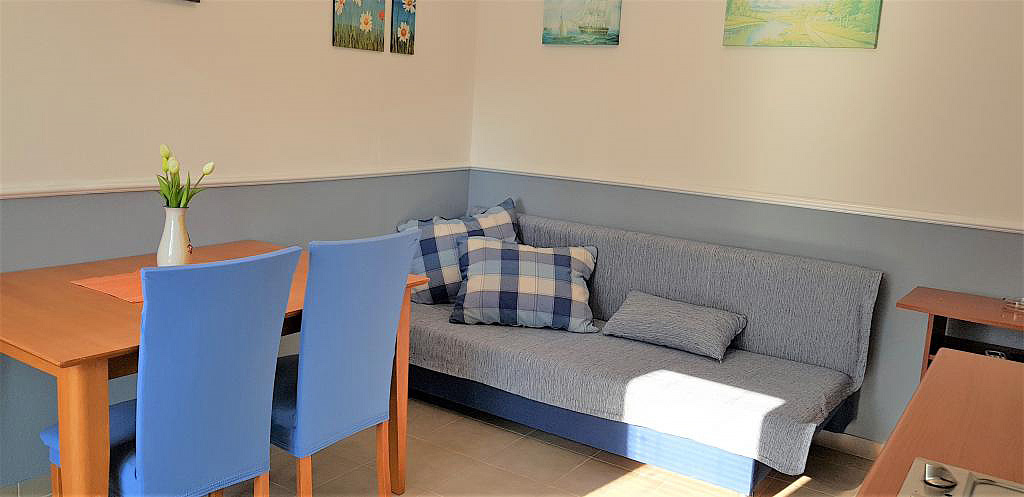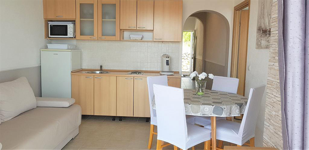 ložnice s manželskou postelí, obývací pokoj s rozkládací postelí pro 2 děti do nedovršených 12 let a kuchyňským plně vybaveným koutem, sociální zařízení se sprchou, francouzské okno, malá terasa mimo apartmán s výhledem na moře
