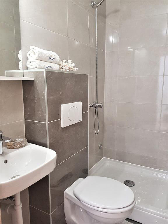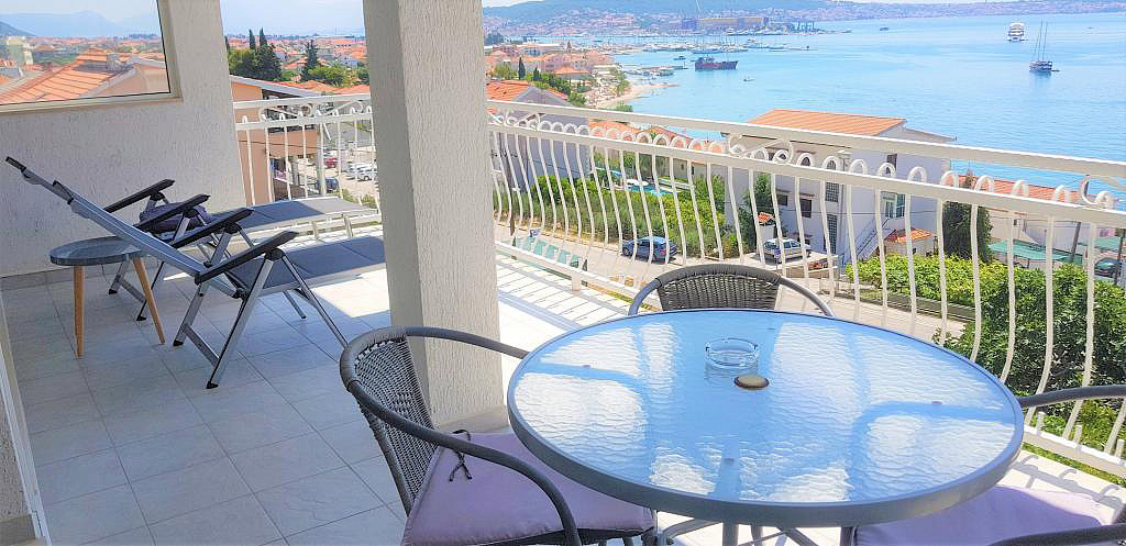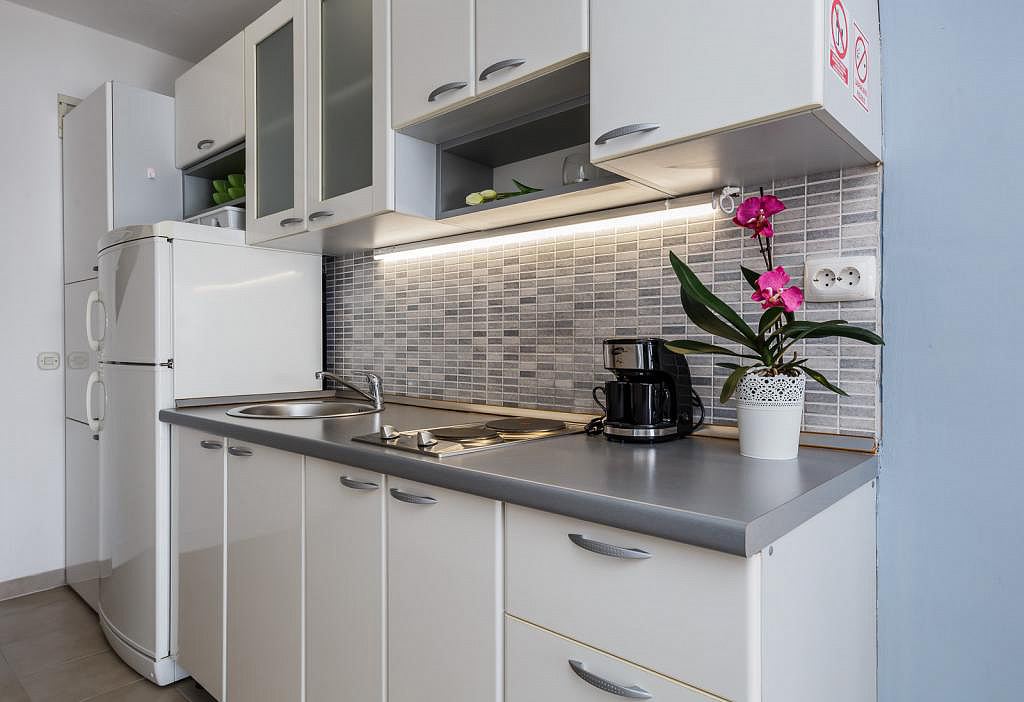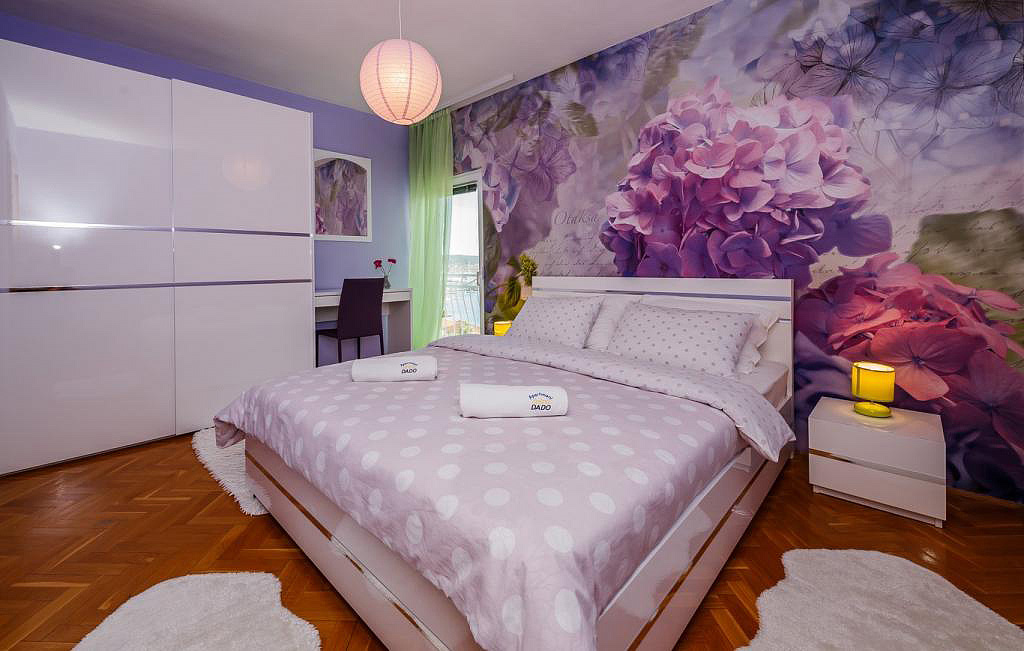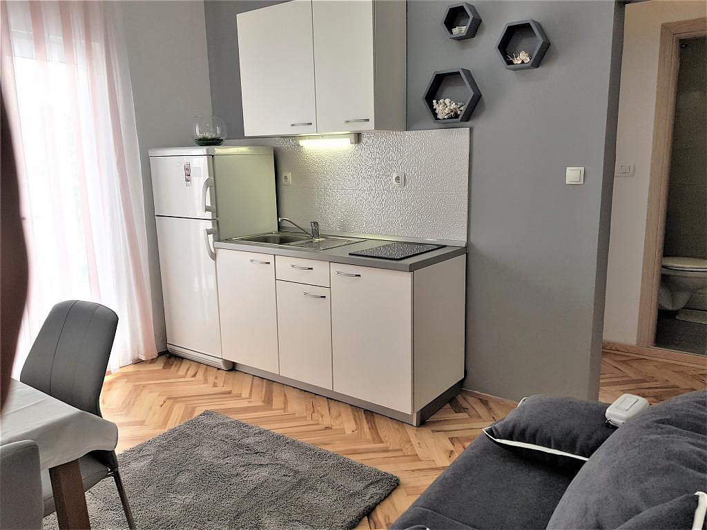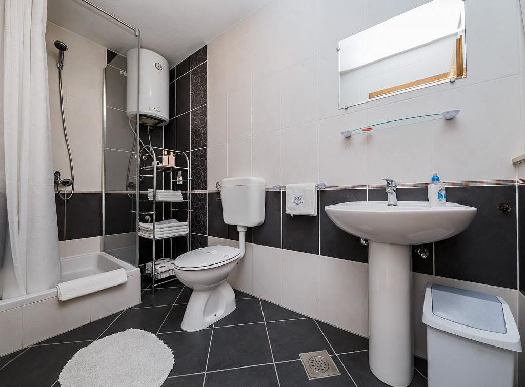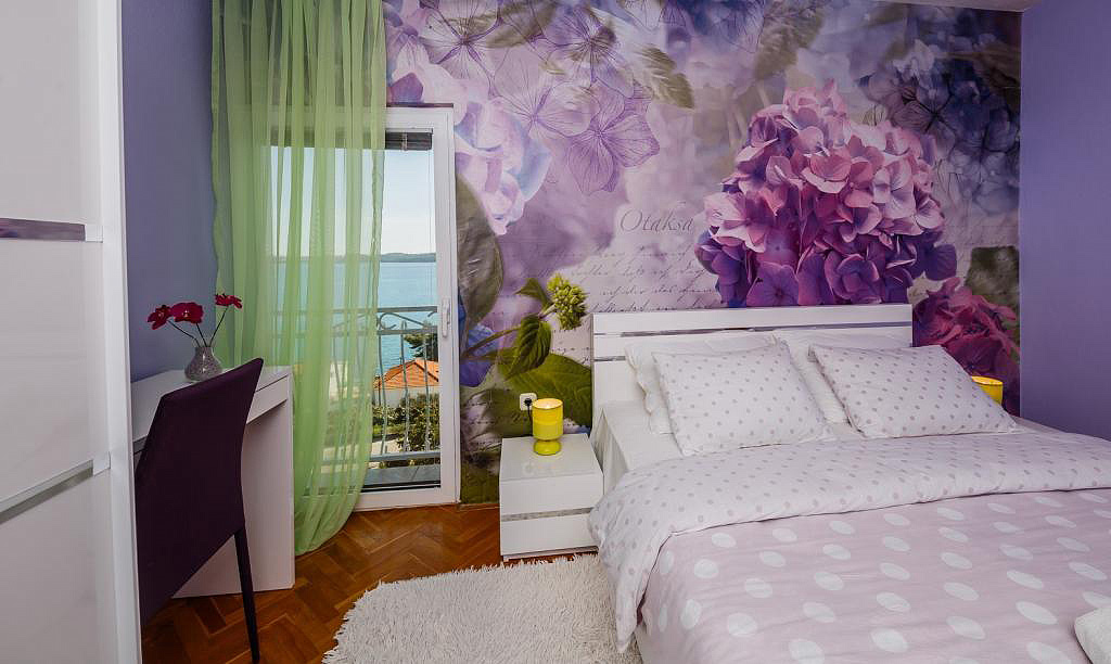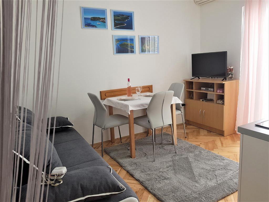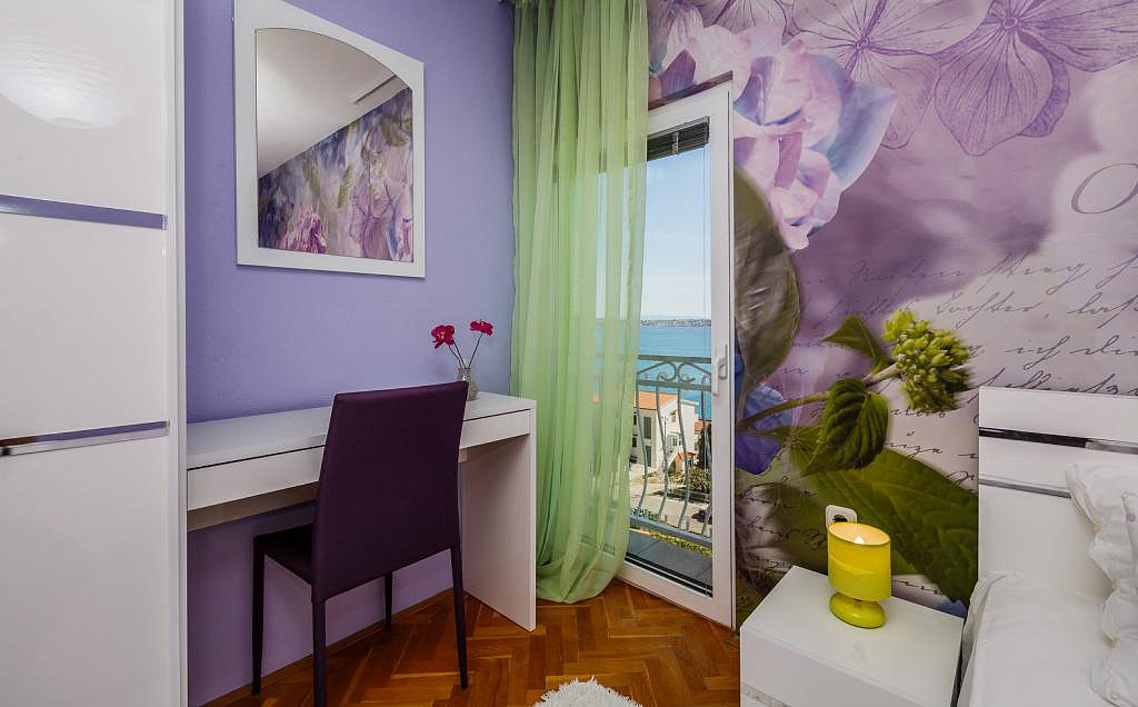 ložnice s manželskou postelí, obývací pokoj s rozkládací postelí pro 2 děti do nedovršených 12 let a kuchyňským plně vybaveným koutem, sociální zařízení se sprchou, francouzské okno, malá terasa mimo apartmán s výhledem na moře