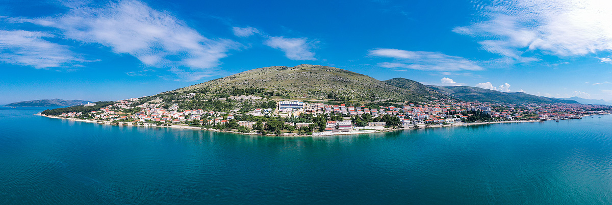 hotel se skládá z hlavní budovy a pavilonů s pokoji, které se táhnou podél mořského pobřeží, z jejichž balkonů a teras je výhled mezi borovicemi na Trogirský záliv a dalmatské ostrovy;