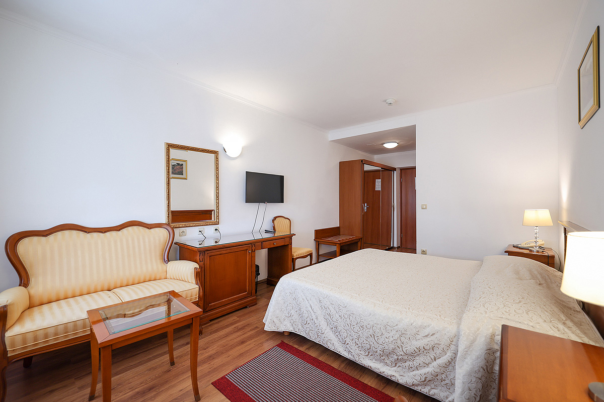 19 m² - pokoj s manželskou postelí či 2 samostatnými lůžky s možností přistýlky formou rozkládacího lůžka, sociální zařízení, pokoj orientován na mořskou stranu; hlavní budova