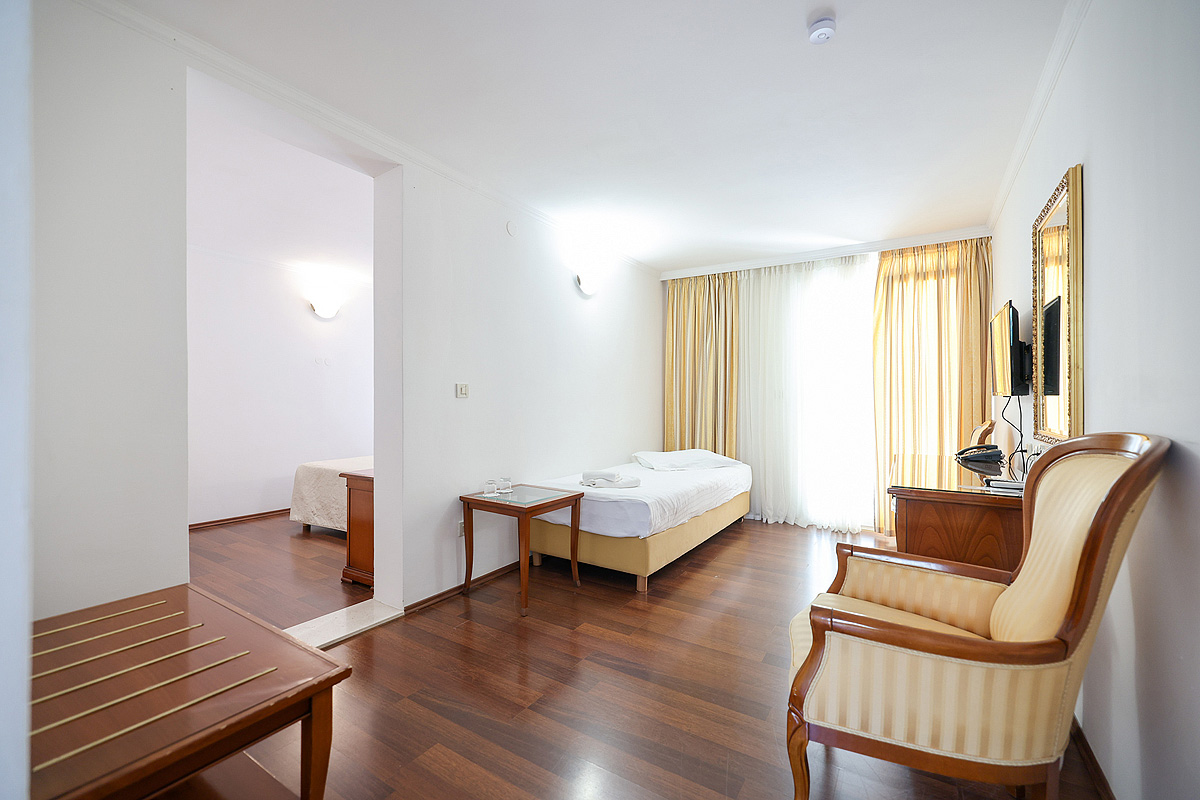 35 m² - pokoj s manželskou postelí či 2 samostatnými lůžky, malý obývací pokoj s gaučem, který lze použít jako přistýlku pro jednu osobu a možností přistýlky formou rozkládacího lůžka, sociální zařízení, balkon orientovaný k moři; pavilon